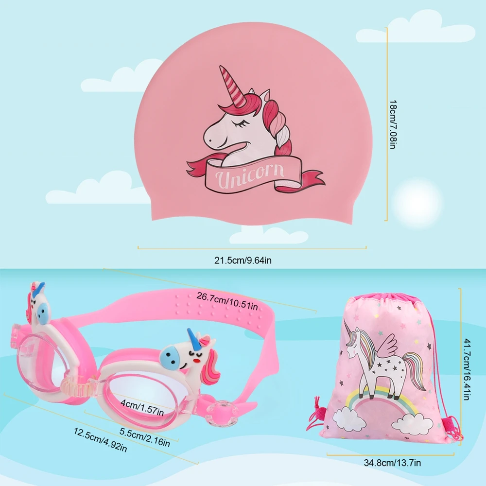 Best Gifts for Kids: Specially designed for children(age 3-12) with short or long hair. Each swim cap comes with a pair of unicorn swim goggles and a unicorn storage bag.