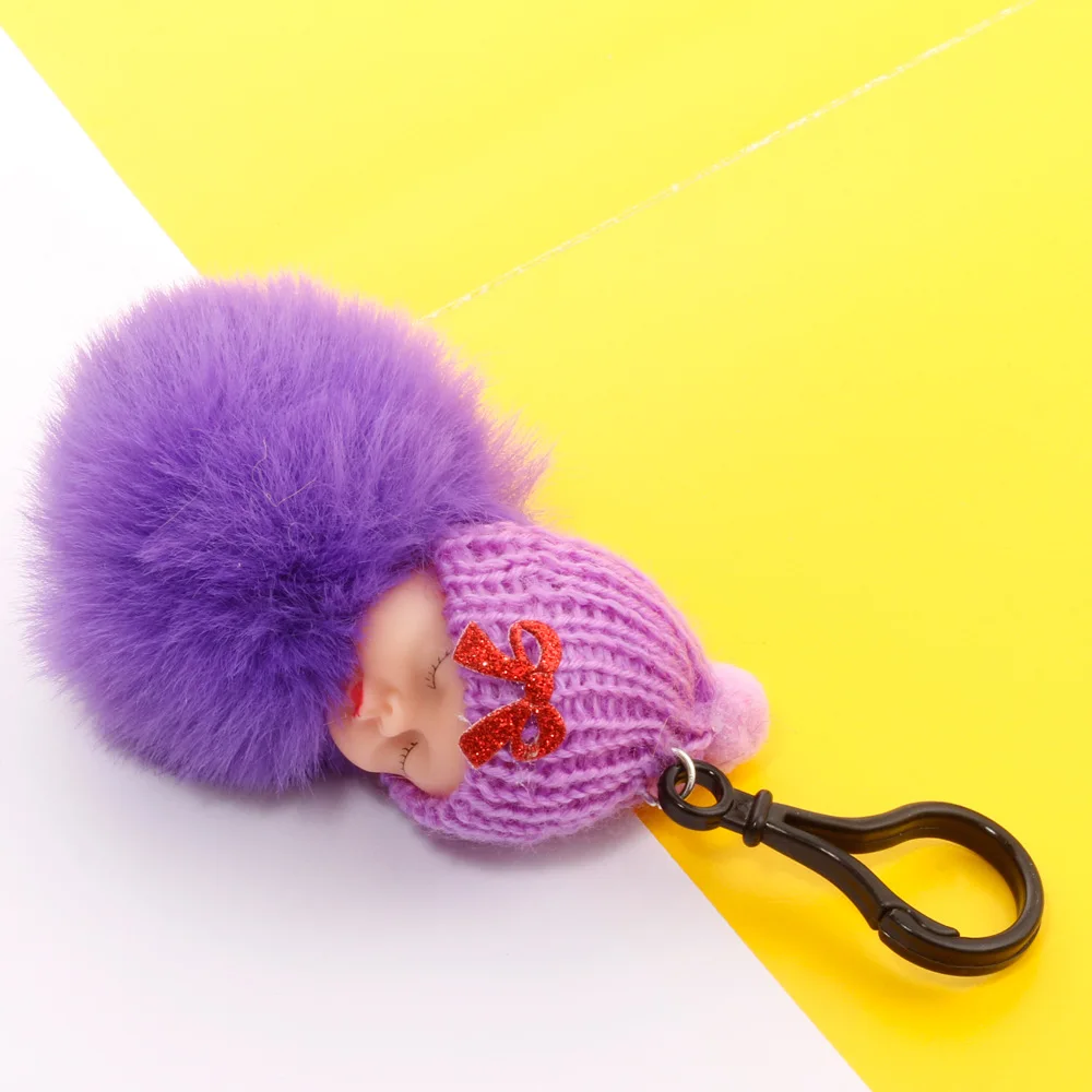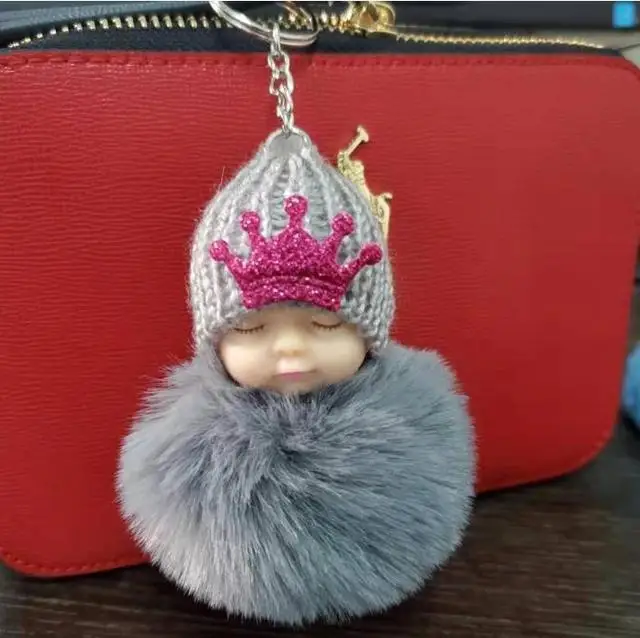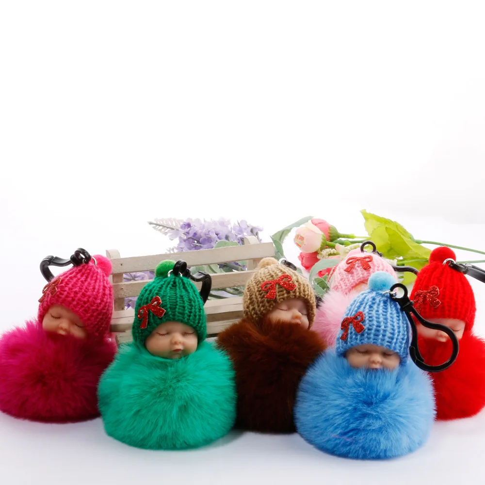 Cute sleeping baby keychain fake Fur Pom Pom Key Chain Women Trinket Car Key Ring Keychain Jewelry Gift fluffy keychain on bag