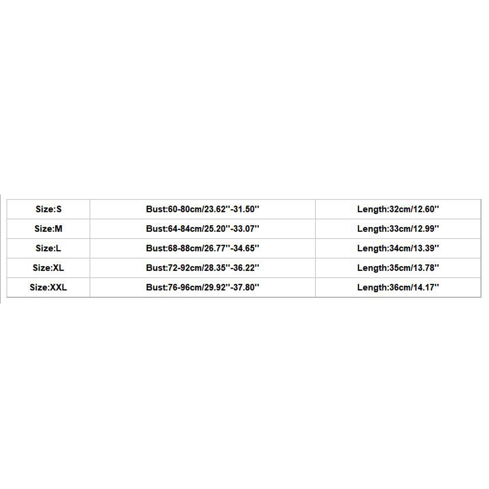 Размеры Бюст Длина S 60-80 см/23,62 ''-31,50'' 32 см/12,60'' М 64-84 см/25,20 ''-33,07'' 33 см/12,99'' L 68-88 см/26,77 ''-34,65'' 34 см/13,39'' XL 72-92 см/28,35 ''-36,22'' 35 см/13,78'' XXL 76-96 см/29,92 ''-37,80'' 36 см/14,17''