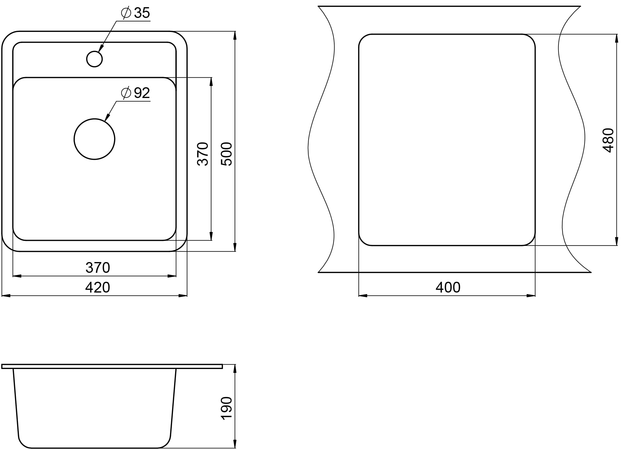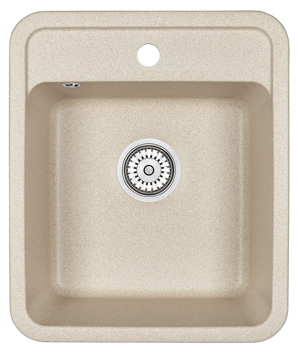 Размер чаши: 370х370 мм. Глубина чаши: 190 мм. Кухонный блок: 400 мм. Установочный проём: 400х480 мм. Материал мойки: кварцевый песок.Комплектация: инструкция, гарантийный талон, сливная арматура.