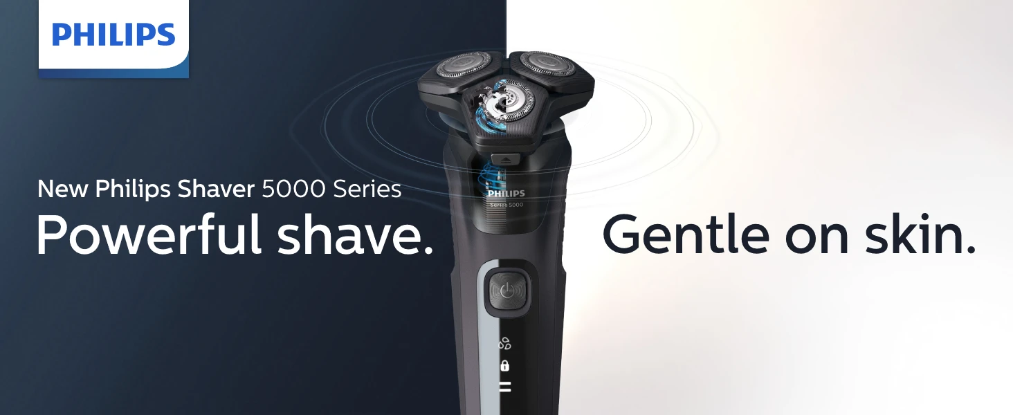 The Philips Series 5000 electric shaver for men glides smoothly over your skin while cutting each hair close. Equipped with an intelligent facial-hair sensor, this men's electric shaver reads hair density 125 times per second, auto-adapting to cut power for an effortless and gentle shave. SteelPrecision self-sharpening blades, 360° flexing heads for an optimal skin contact, and a waterproof ability to perform in both wet and dry conditions give you a thorough and comfortable shaving experience. It comes with an open flip head that is rinsed with water for cleaning and an intuitive display that includes 3 level battery status, cleaning advice, and travel lock indicator, an integrated trimmer, and a travel case. At Philips, we drive sustainability in all aspects of product creation. Our production facility for blades uses 100% renewable electricity, and our packaging is made with recyclable materials. All shavers come with an Eco passport. Versus its Philips predecessor.