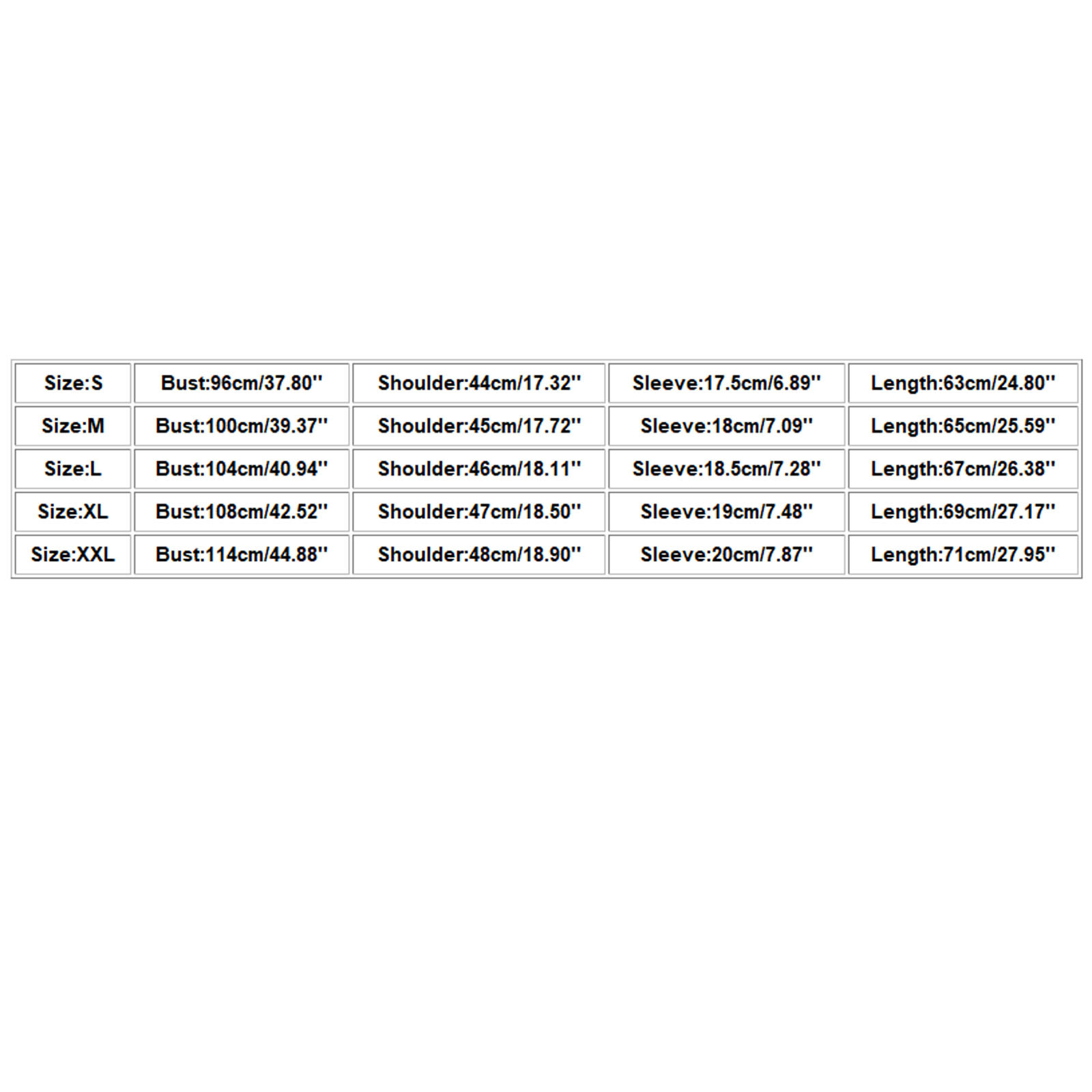 Size Bust Shoulder Sleeve Length S 96cm/37.80'' 44cm/17.32'' 17.5cm/6.89'' 63cm/24.80'' M 100cm/39.37'' 45cm/17.72'' 18cm/7.09'' 65cm/25.59'' L 104cm/40.94'' 46cm/18.11'' 18.5cm/7.28'' 67cm/26.38'' XL 108cm/42.52'' 47cm/18.50'' 19cm/7.48'' 69cm/27.17'' XXL 114cm/44.88'' 48cm/18.90'' 20cm/7.87'' 71cm/27.95''Мне данные часы очень понравились своим дизайном. Были мне доставлены за неделю. Доставлены в практичной упаковке, пришло всё целое. Часы... Читать отзыв полностью...