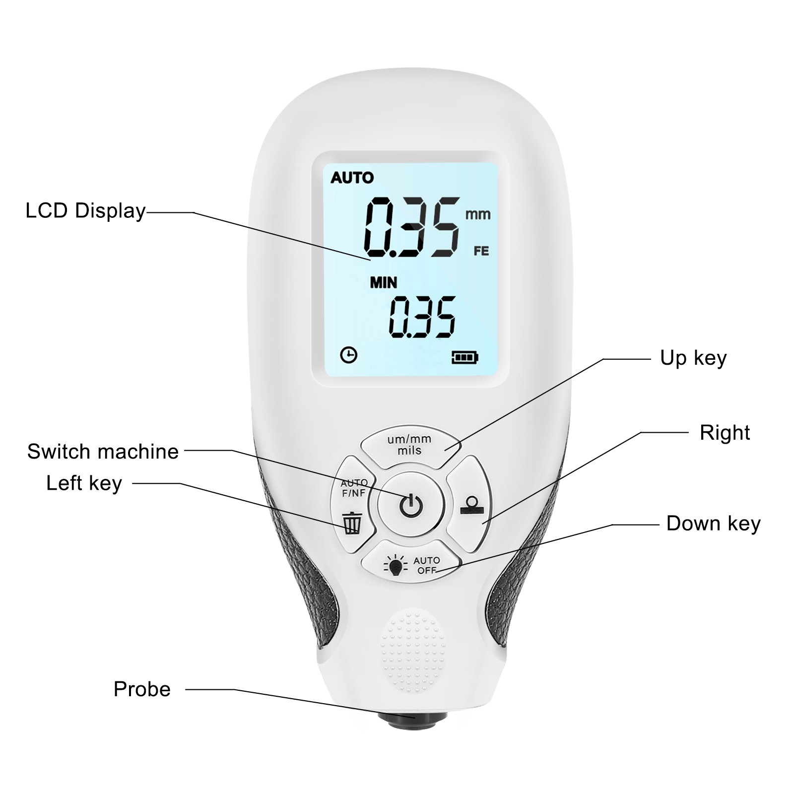 【Измерение Дальномер 0-2000 мкм. Разрешение: 0,01 мм/1mil. Точность измерения: ±(3% + 1 мкм). 【Материал 】 изготовлен из АБС-пластика, Прочный для использования. 【Material】 автоматический Калибровка, хранение данных. Мини-размер с ЖК-дисплеем. 【Function】This портативный Толщиномер покрытия, может измерять толщину покрытия (например, Краски, пленки и т. Д.) на металлической подложке быстро, неразрушающе и Точно.Характеристики: