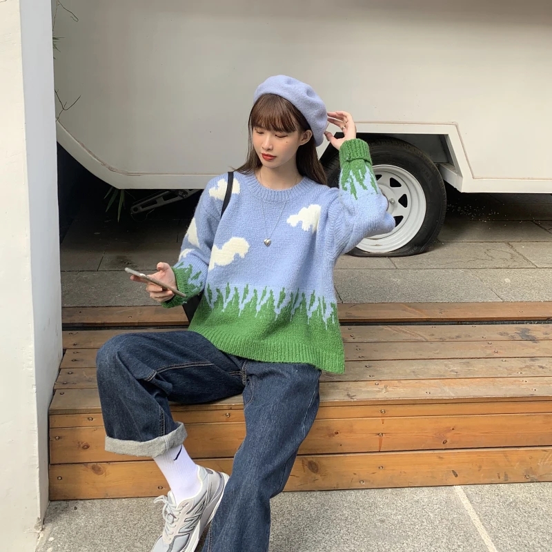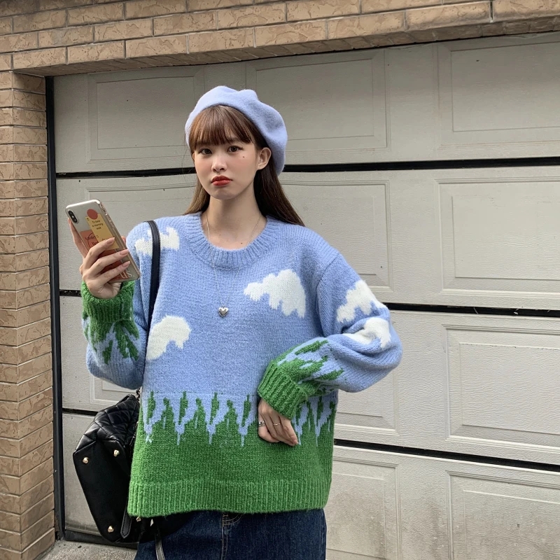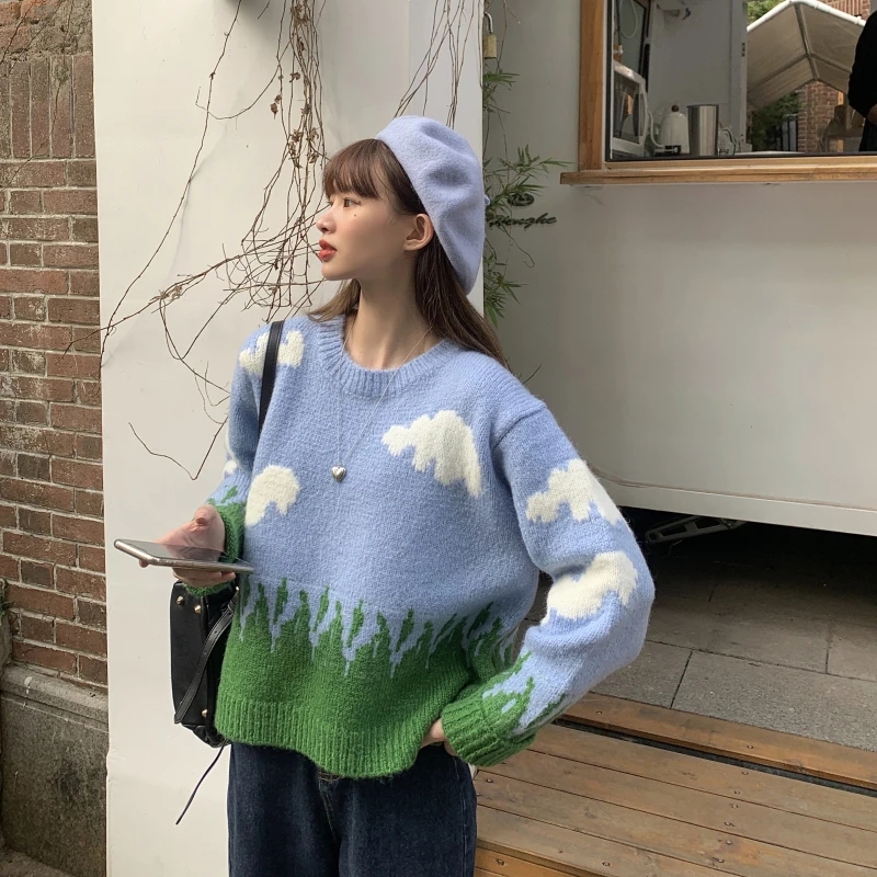 Женские свободные свитера с круглым вырезом, Повседневные вязаные пуловеры с длинным рукавом и принтом облачной травы