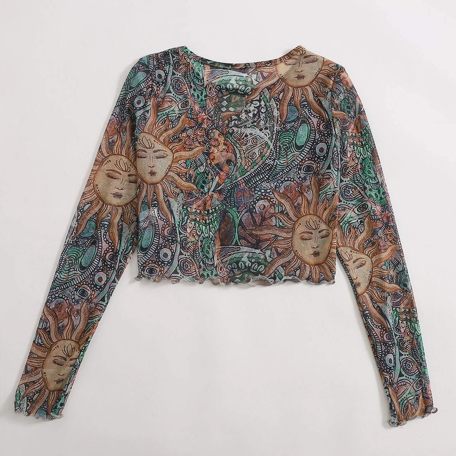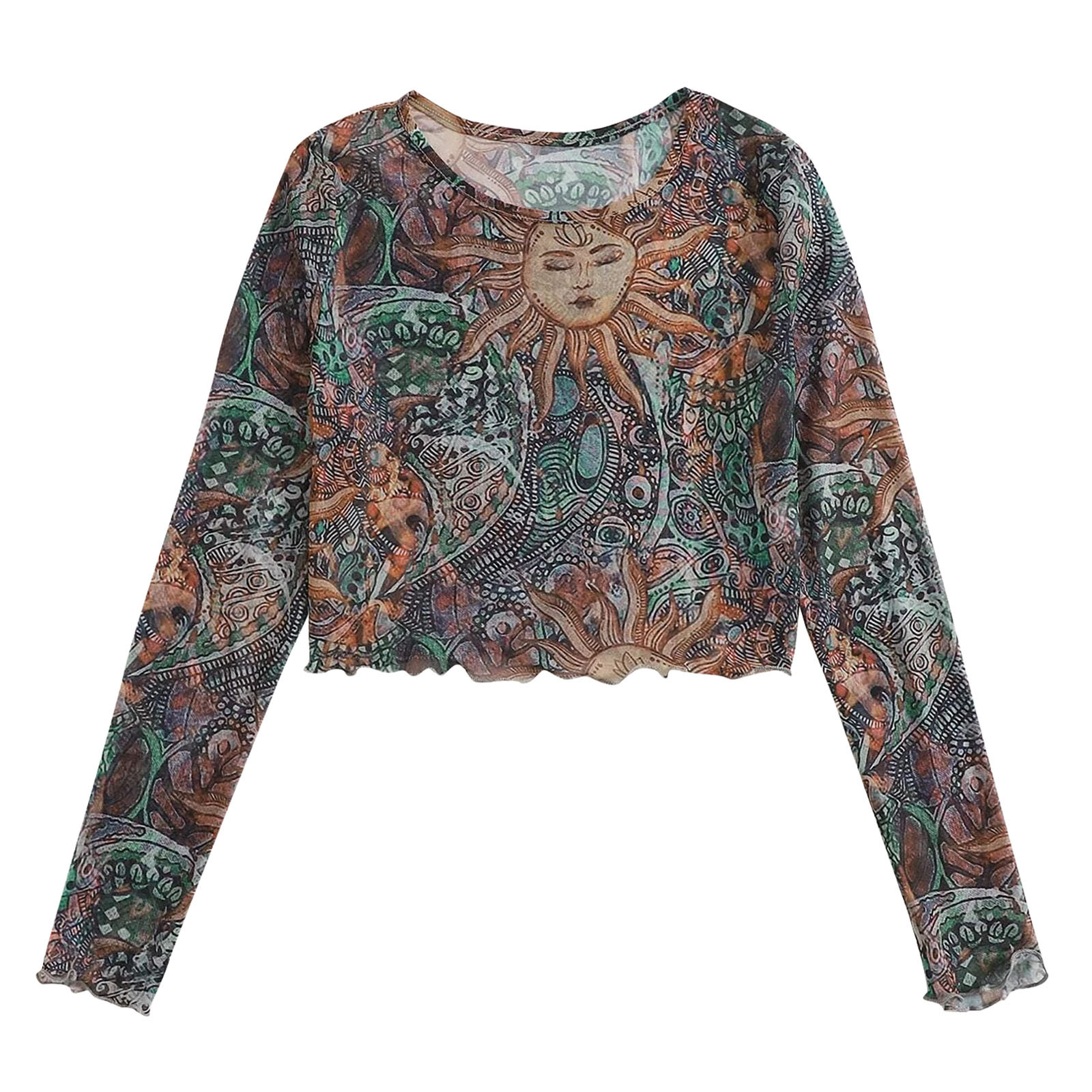 Женская модная Сетчатая футболка с коротким рукавом с принтом Sun Moon, топ с круглым вырезом