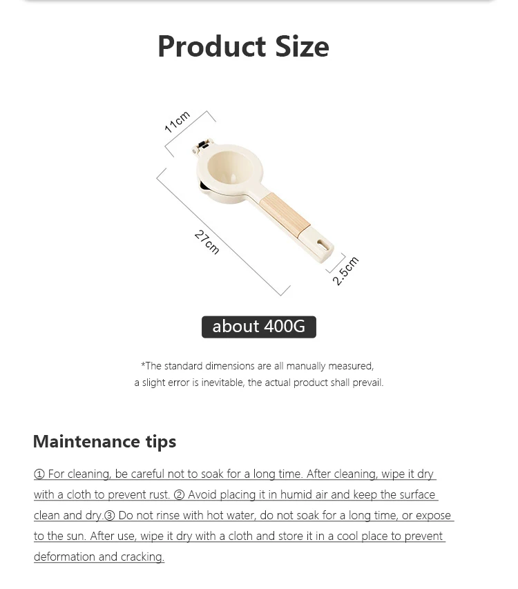 Материал: цинковый сплав/алюминиевый сплав Размеры: 27*11*2,5 см/22*7,5*2 см Вес: 400g / 395g Применение: подходит для различных видов фруктов, таких как лайм, лимон, цитрусовые, имбирь, яблоко, сахарный тростник и т. Д.