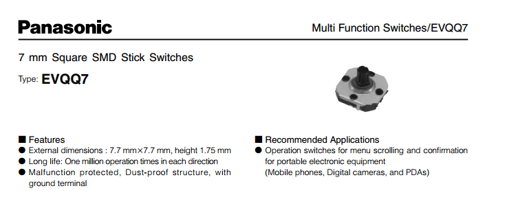 Original imported Japanese EVQQ7GA50 multi-directional 5-way button switch 7.7*7.7*5 SMD stick five-way button, multi-function sealed, waterproof and dust-proof, light touch car navigation button, digital camera operation switch, menu scrolling, palmtop computer, etc. It can be used for long life and high temperature resistance. Disk 1000PCS has detailed information and size chart
