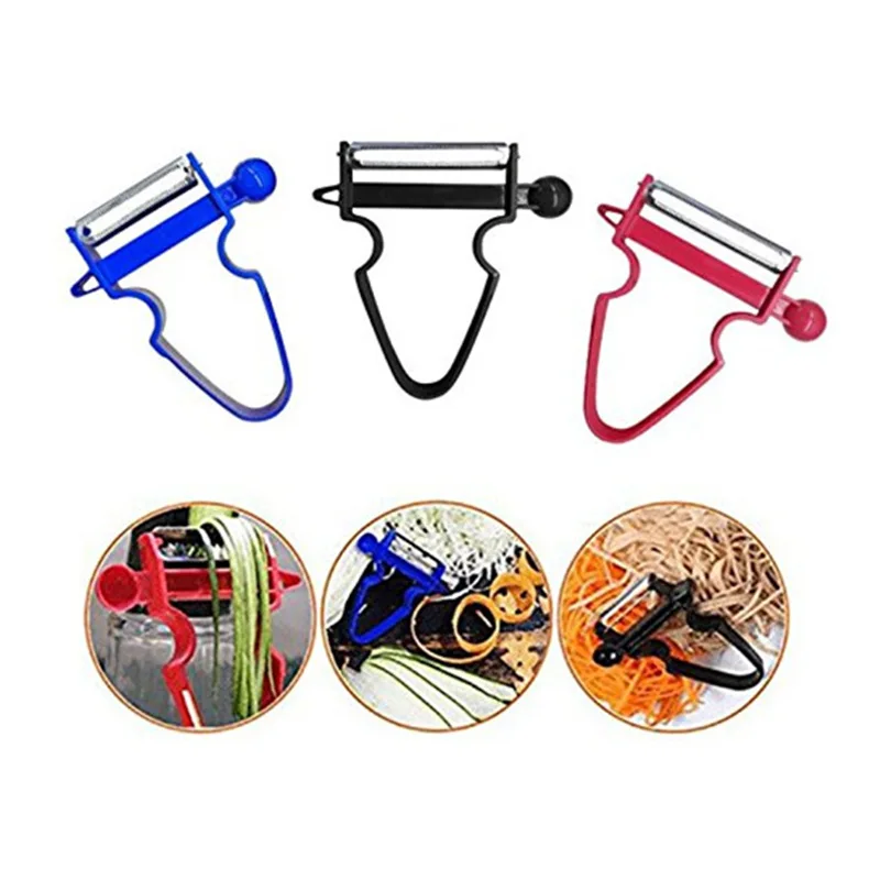 Один черный 50 мм Овощечистка: Общий пилинг картофеля, моркови, яблок, тыквы, ананасов, помидоров. Один синий 68 мм Овощечистка: Измельчитель капусты, слайсер для сыра, ленты, тонкая нарезка. Один красный Овощечистка: Julienne, zucchini лапша, тыква спагетти. Если это то, что вы просите у peelers, то этот удивительный Peelers сделан для вас! Овощечистка имеет двойное острое лезвие из нержавеющей стали. Шарнир для гладкого, легкого пилинга. Ручка удобна даже во время повторяющихся ударов. Встроенный очиститель для глаз картофеля и апельсиновая Овощечистка. Сейф для посудомоечной машины. Независимо от задачи, Овощечистка должна обрабатывать удары и изгибы с легкостью и без засорения или потери края. Материал: АБС-пластик Размер: прибл. 10*8,5*1,4 см Цвет: черный, синий, красный