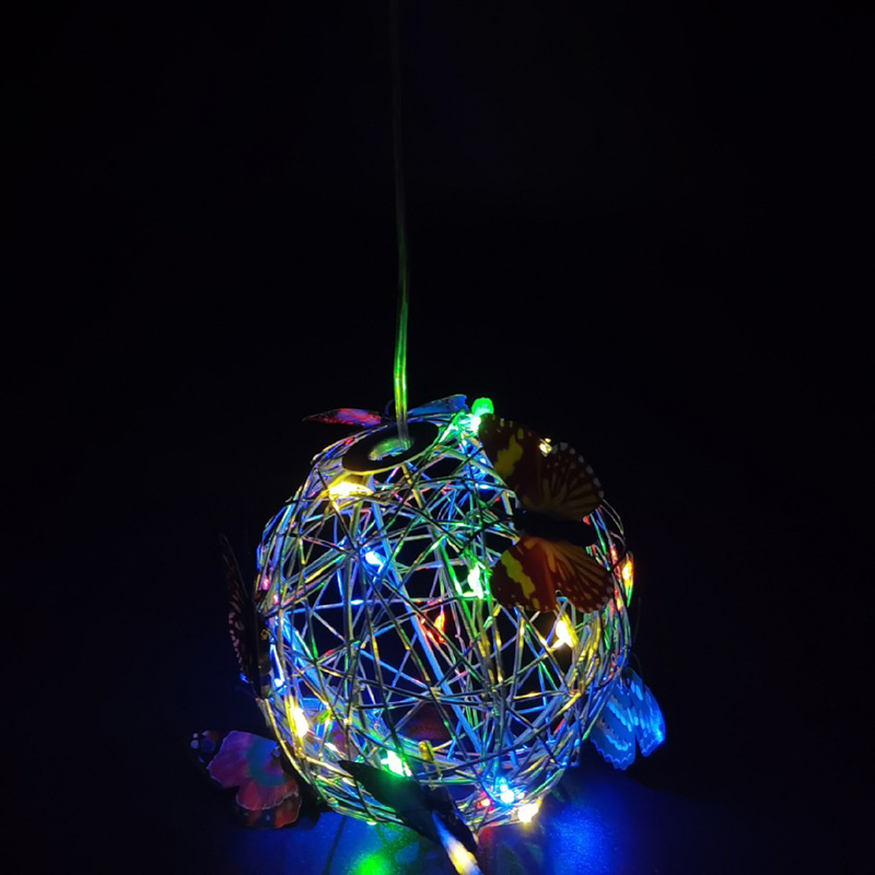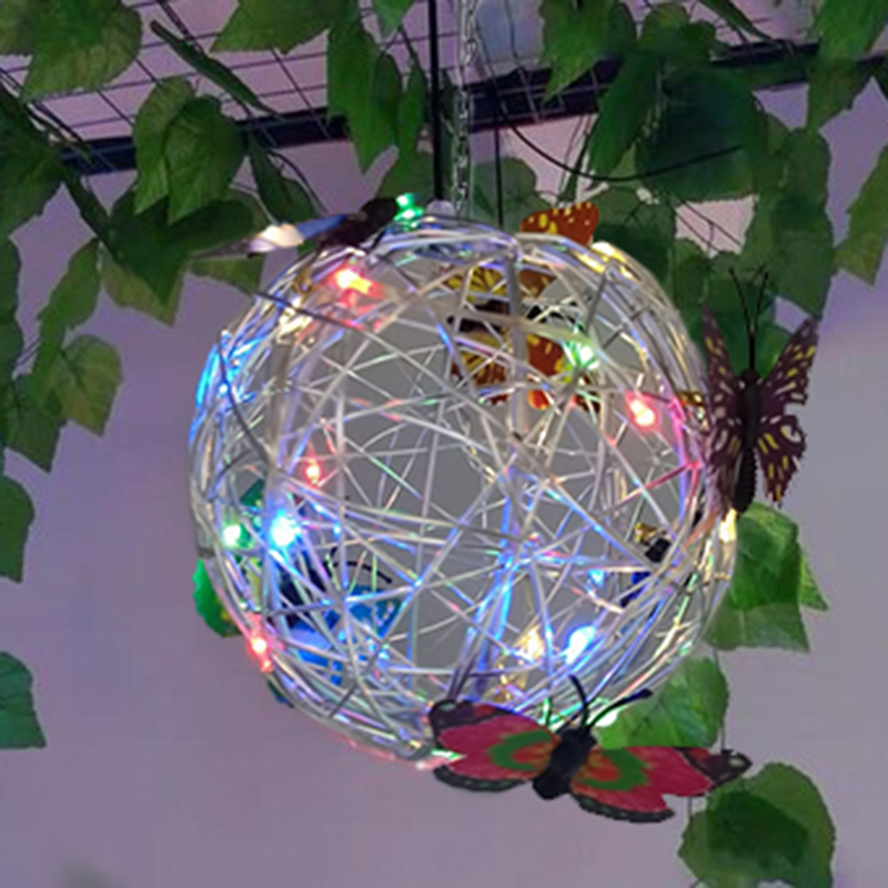 4. Этот уникальный металлический сетчатый шар украшен металлическими бабочками в разные размеры и цветовые схемы.