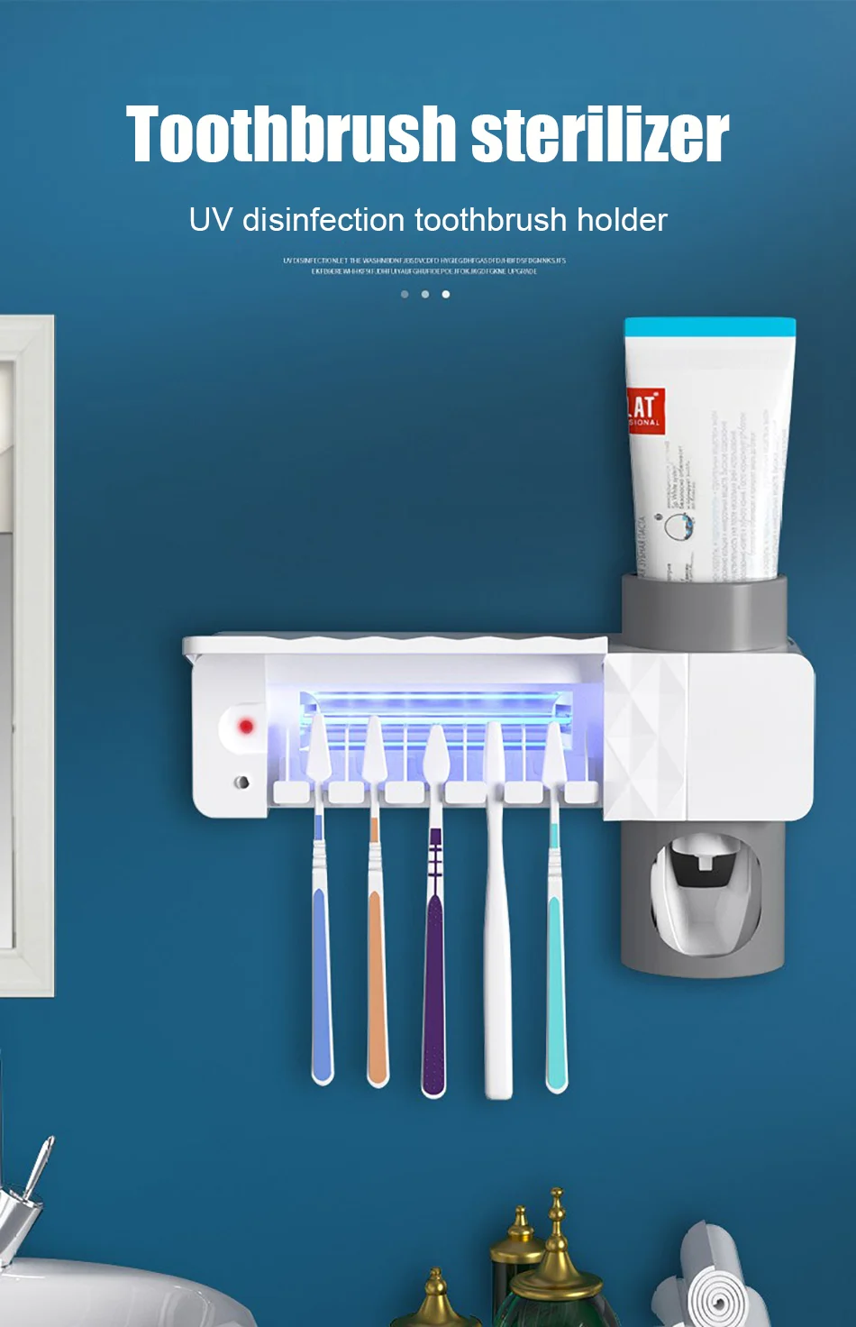 Особенности1.2.3.ПараметрыЦвета:Размер:Вес:Материал:Примечание:· Фактический размер ручного измерения может иметь некоторые ошибки. Фактический размер зависит от фактического товара.· Из-за различных условий освещения и съемки цвет изображения может немного отличаться от фактического продукта. Пожалуйста, ознакомьтесь с фактическим товаром.Особенности1. Держатель зубной пасты и настенное крепление для экономии места.2. Количественный дизайн экономит зубную пасту, защищает зубную щетку от перекрестной инфекции.3,3-1 функция, в том числе для зубных щёток, дозатор для зубной пасты, зубная щетка УФ стерилизатор.ПараметрыЦвета: белыйРазмер: 22,5х13, 1 смВес: 440 гМатериал: пластикПримечание:· Фактический размер ручного измерения может иметь некоторые ошибки. Фактический размер зависит от фактического товара.· Из-за различных условий освещения и съемки цвет изображения может немного отличаться от фактического продукта. Пожалуйста, ознакомьтесь с фактическим товаром.