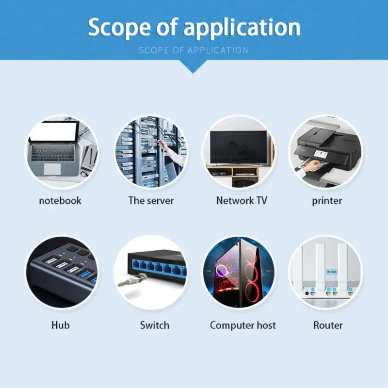 Широкий диапазон применения, совместим со всеми устройствами интерфейса RJ45, настольными компьютерами, ноутбуками, маршрутизаторами, переключателями, smart TV s, телеприставками, телевизионными коробками, концентраторами, ADSL и т. д.