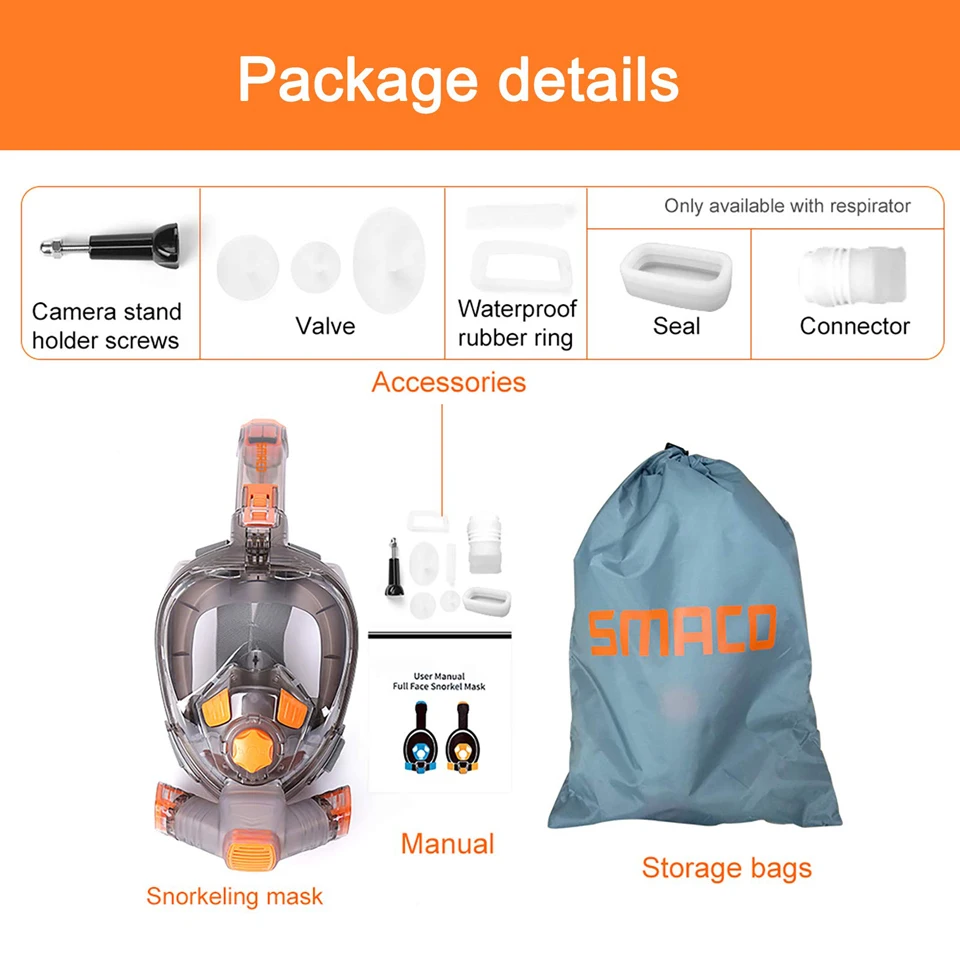 SMACO snorkeling mask Made of premium food grade liquid silicone and the full face snorkel mask is super comfortable to wear and adjust, and never smells bad like other cheap gel-made snorkel mask full face, best snorkel solution!