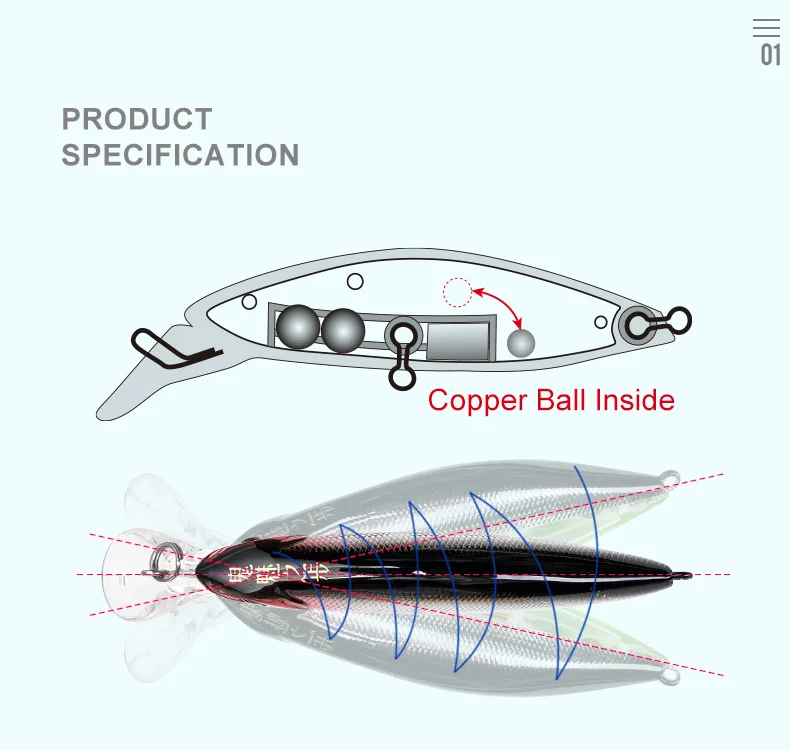 3. Внутри корпуса приманки находится медный шар, центр тяжести движется назад после отливки. Когда вы дергаете, центр тяжести движется вперед, чтобы сохранить его в равновесии на мгновенной основе.