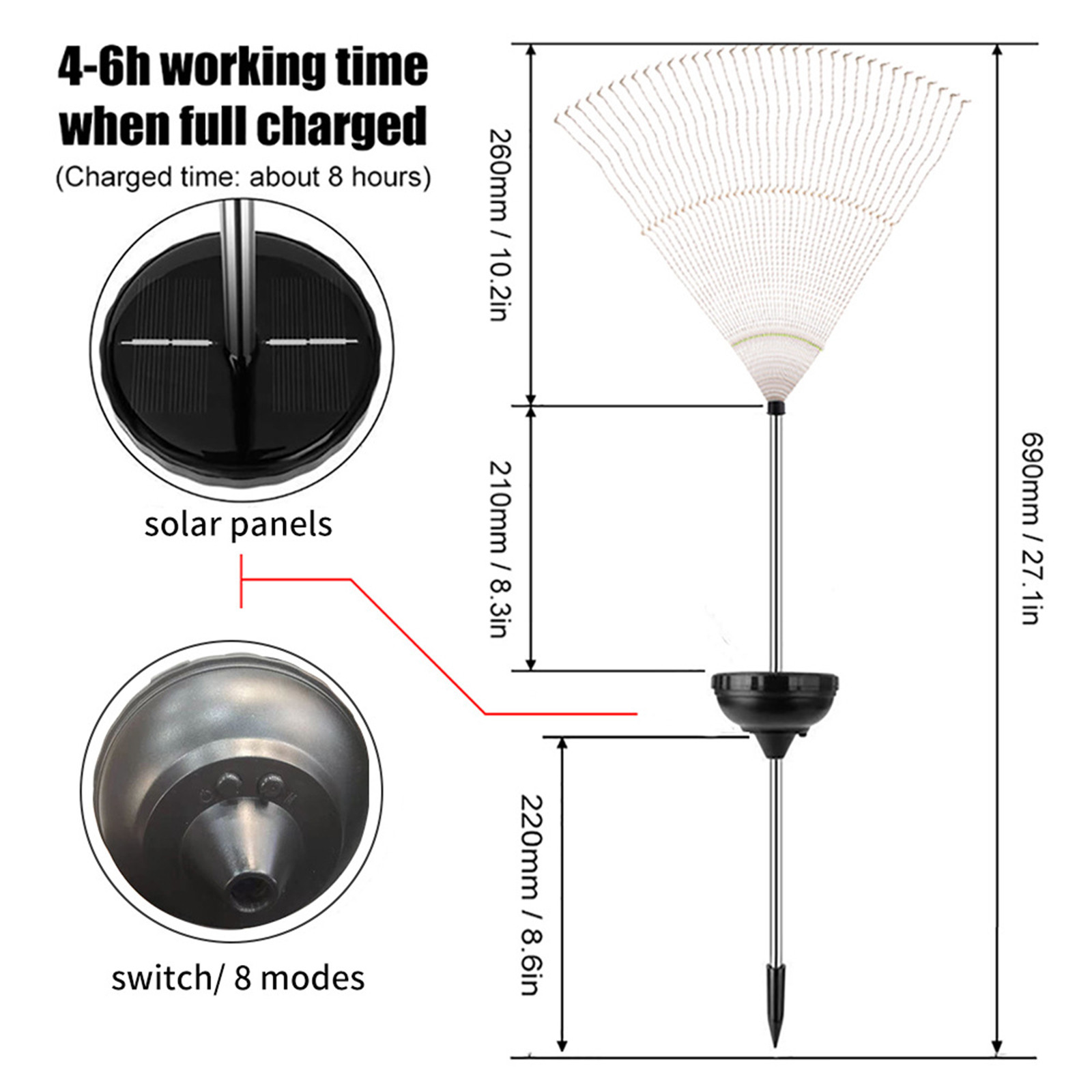 Солнечная батарея Аккумуляторная батарея-оснащена перезаряжаемой батареей 600 мАч, это Солнечные лампы могут работать около 6-8 часов ночью при полной зарядке В течение дня.