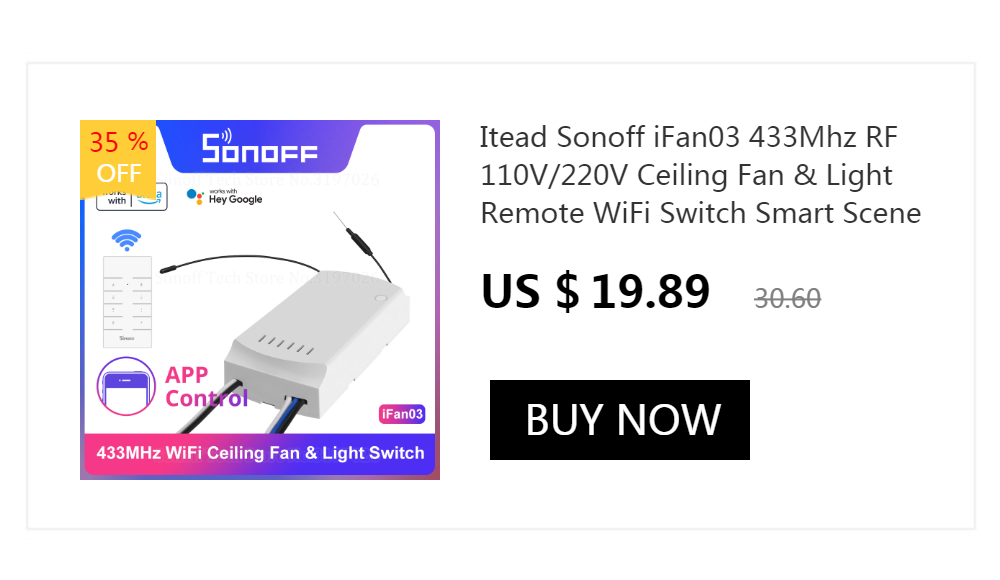 Ищете умный выключатель, чтобы легко управлять потолочным вентилятором, подвесной светильник сверху? Прекратите искать! SONOFF iFan03/iFan04-это то, что вам нужно. iFan03/iFan04, новинка версия iFan02, более стабильная производительность, которая является беспроводного доступа в Интернет Wi-Fi потолочный вентилятор и светильник контроллер поддерживает для того чтобы контролировать потолочный вентилятор с светильник с помощью вашего телефона, где бы вы ни находились. Голосовое управление предназначено для того, чтобы вы могли легко управлять iFan03/iFan04, чтобы включить или выключить вентилятор и светильник, не требуется никакого ручного управления. Поддержка управления потолочным вентилятором с помощью светильник с телефона, где бы вы ни находились и когда бы вы ни хотели. Расписание для его включения и выключения в дневное или ночное время, или в любое время в течение дня, и он включится или выключится автоматически. Поставляется с пультом дистанционного управления RM433, где вы можете регулировать вентилятор среди низкой, средней и высокой скорости для получения различных уровней прохлады. Функция сцен в приложении позволяет управлять одним или несколькими устройствами SONOFF, быстро и одновременно с одним касанием.