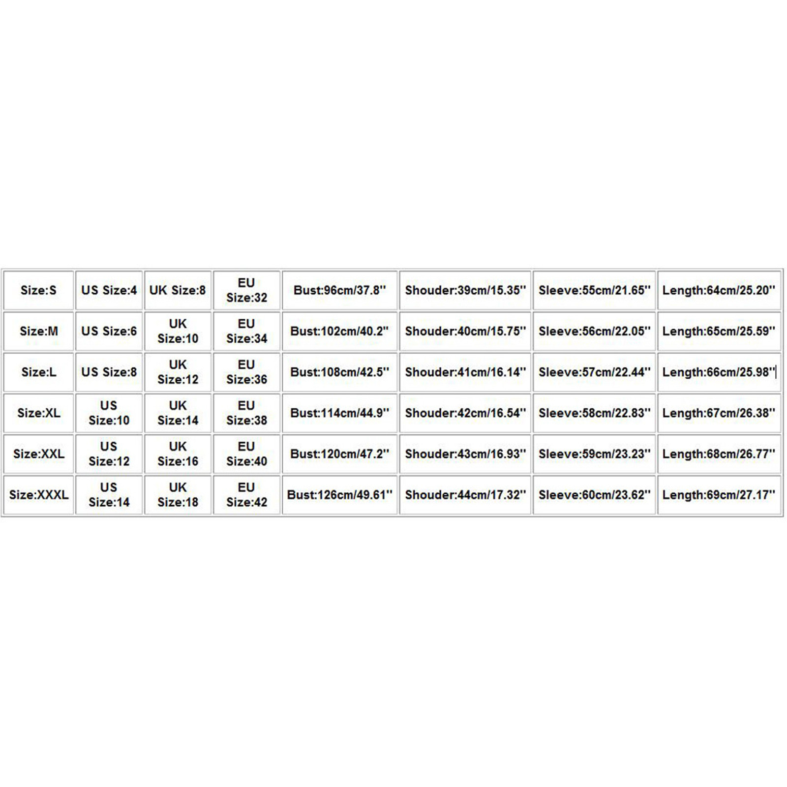 Пожалуйста, сравните детальные размеры с вашими перед покупкой! Цвета могут немного отличаться в зависимости от настроек компьютера и монитора Возможны незначительные отклонения в размере на 1-3 см разницу в размерах ввиду того, что Замеры производились вручную, спасибо (все размеры указаны в см, обратите внимание: 1 см = 0,39 дюйма) Таблица размеров: Размеры Американский размер Размер Великобритании Европейский размер Бюст Shouder Рукав Длина S 4 8 32 96 см/37,8'' 39 см/15,35'' 55 см/21,65'' 64 см/25,20'' М 6 10 34 102 см/40,2" 40 см/15,75'' 56 см/22,05'' 65 см/25,59'' L 8 12 36 108 см/42,5'' 41 см/16,14'' 57 см/22,44'' 66 см/25,98'' XL 10 14 38 114 см/44,9'' 42 см/16,54'' 58 см/22,83'' 67 см/26,38'' XXL 12 16 40 120 см/47,2'' 43 см/16,93'' 59 см/23,23'' 68 см/26,77''Решил заказать для своей дочки платье на Новый Год. Приглянулось данный товар. Доставку ждал около трех месяцев, главное, что пришел... Читать отзыв полностью...
