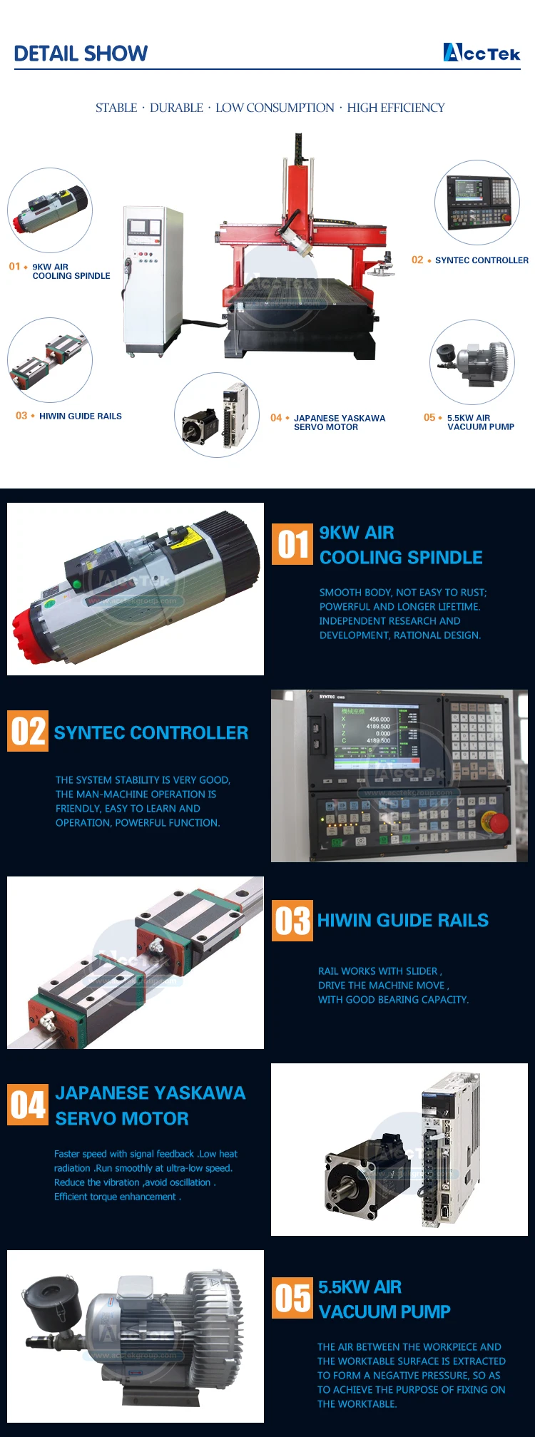 ПараметрыX Y Z рабочая зона оси1500*2500*450 мм * 180 градусовТокарная структураБесшовная сварная стальная конструкция, лучше, чем чугуннаяX,Y структураСтойка и шестерня, привод шестерни, Тайвань 25 мм квадратные направляющиеСтруктура ZТайвань TBI шариковый винт, Тайвань 25 мм квадратные направляющиеШпиндель6,0 кВтРабочий режимСервоприводДвигатель и драйверЯпонский Серводвигатель Yaskawa и драйверыОперационная системаSyntec 6 МбМакс. Скорость путешествия55 м/минМаксимальная рабочая скорость20 м/минСовместимое программное обеспечениеUcancam/Type3/Artcam/Artcut и т. Д.Разрешение0,01 ммКомандаКод G (HPGL, U00, mmg, plt)Рабочее напряжениеAC220V,1PH или 380V,3PH В переменного тока, 50/60 ГцПодробные изображения