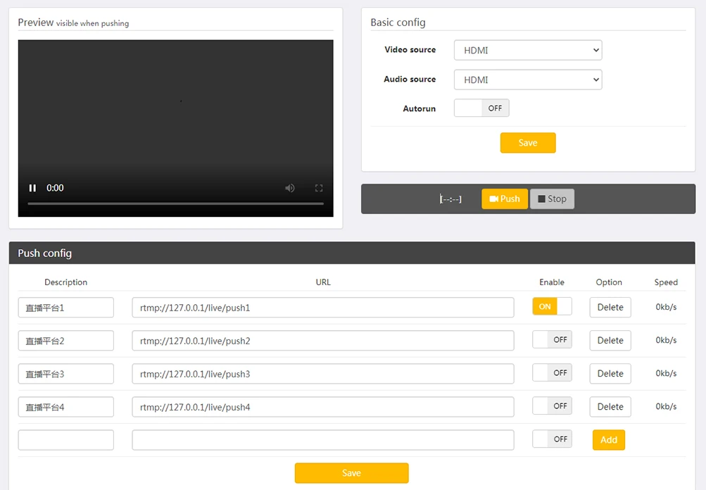 Большинство нажатий url могут быть заполнены (Толчок столбца url), Не только RTMP,Но также поддерживает RTMPS, RTSP, UDP и другие методы push.