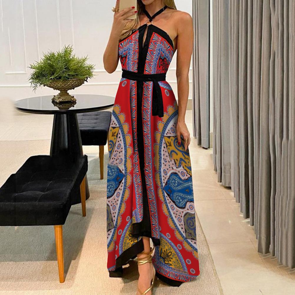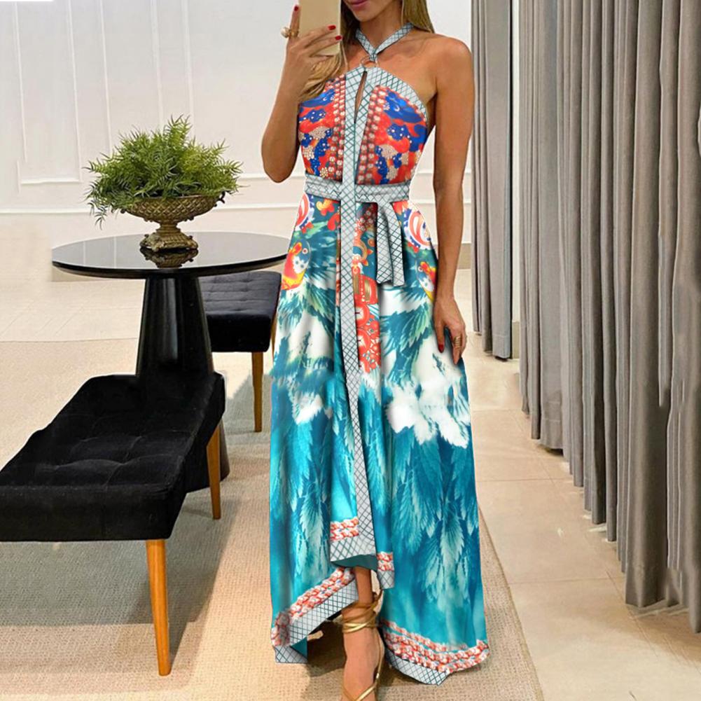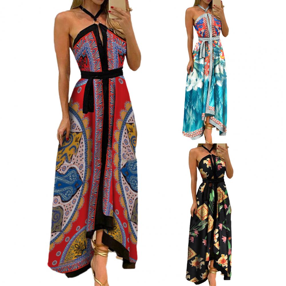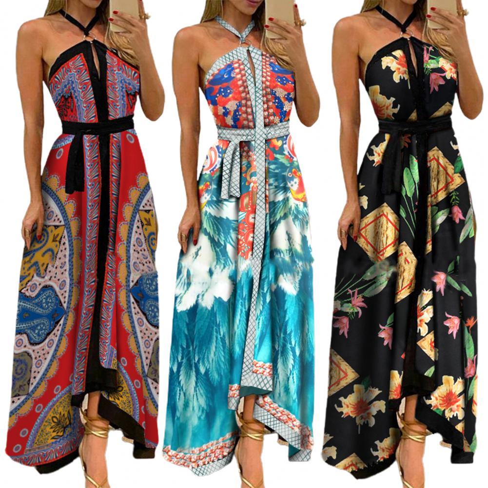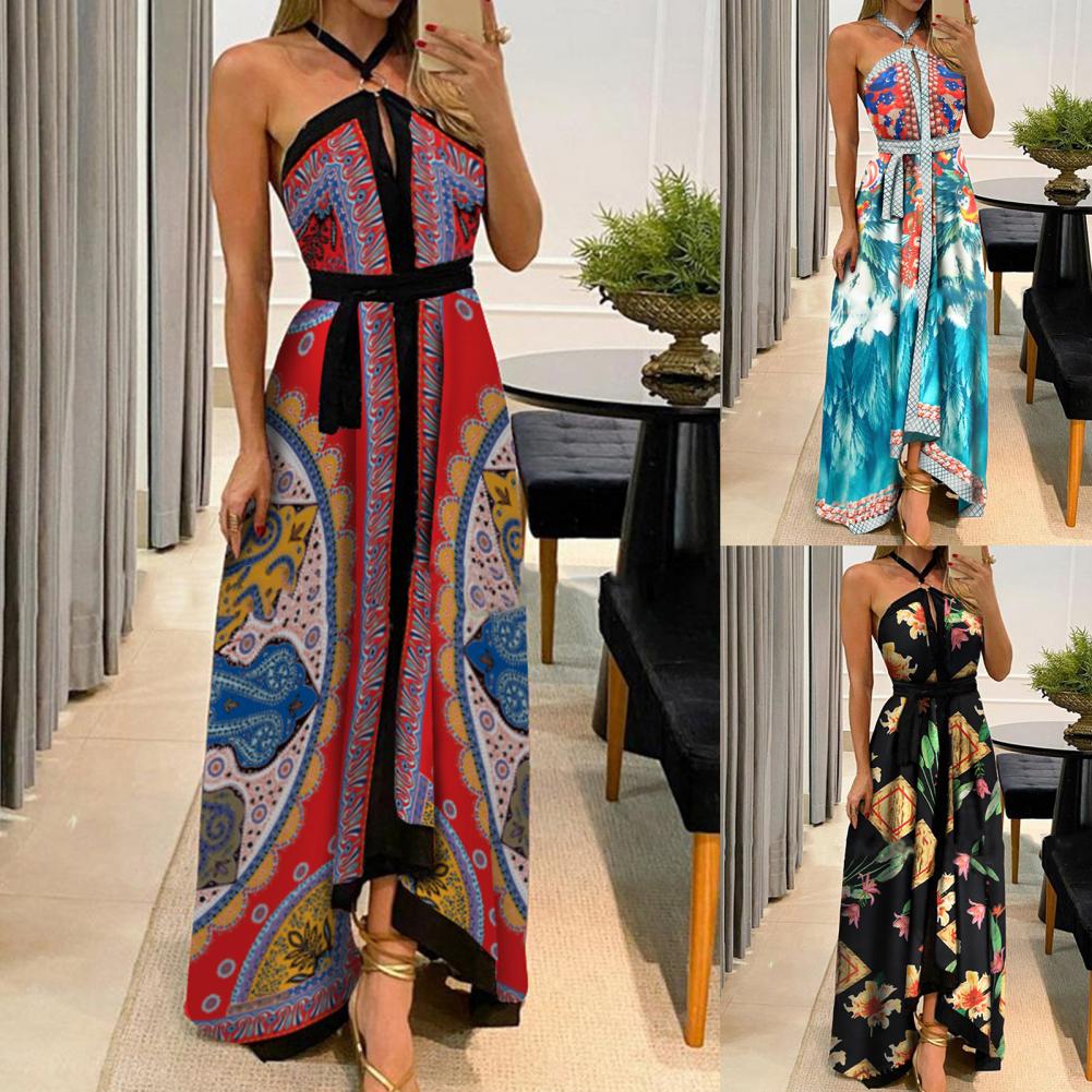 Летнее женское платье с цветочным принтом и открытыми плечами, винтажное платье с лямкой на шее, без бретелек, макси платье, сарафан с большим подолом, Макси платье с открытой спиной