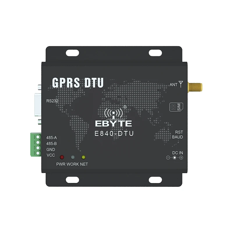 RF параметр Описание Беспроводной стандарт GSM/GPRS/EDGE Стандартная частота 850/900/1800/1900 МГц Мощность передачи GSM900 Класс 4 (2 Вт),DCS1800 Класс 1 (1 Вт) Устройство класса терминала GPRS Класс B GPRS мульти-слот класса GPRS класс 10 Схемы кодирования GPRS CS1 ~ CS4 Характеристики оборудования Описание Интерфейс антенны SMA-K Интерфейс передачи данных RS485 / RS232 Скорость передачи данных 2400bps- 115200bps Рабочее напряжение DC 5V ~ 36V Рабочий ток 59mA ~ 65mA(12V) Температура хранения-40 ℃-85 ℃