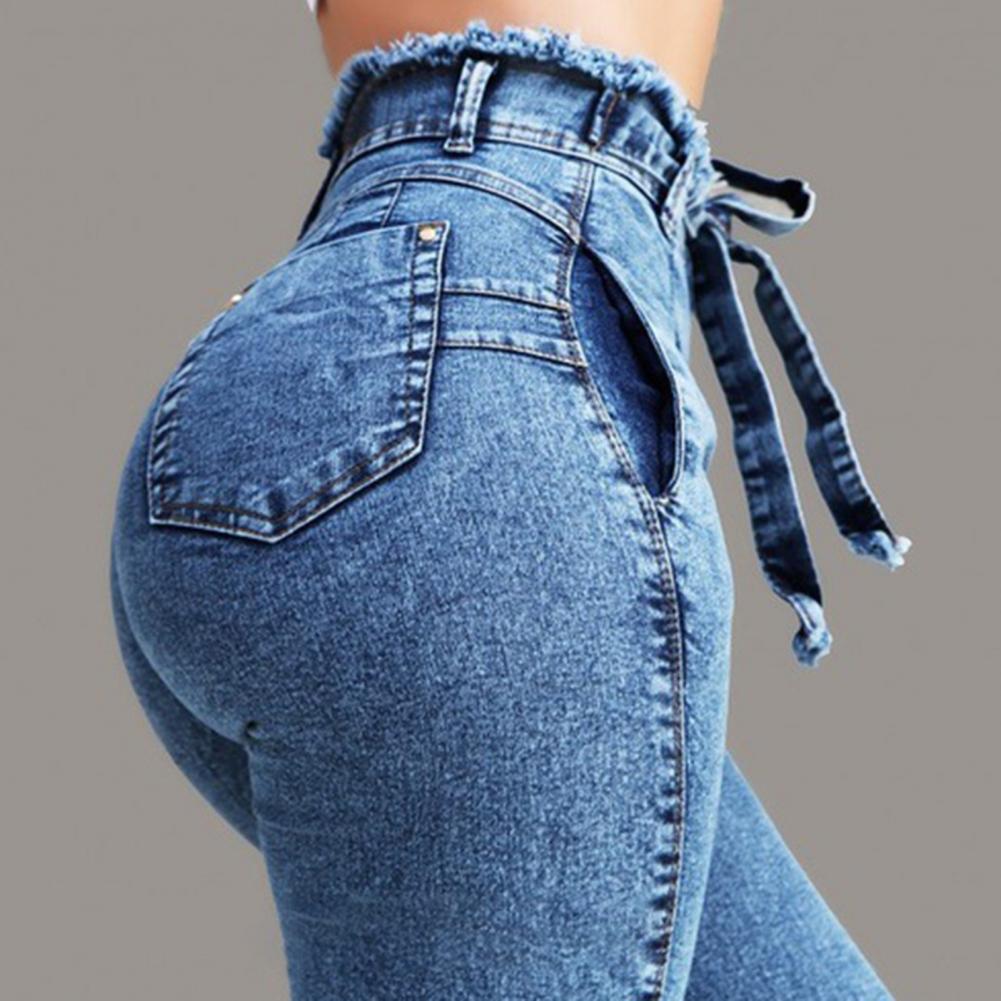 Женские джинсы с высокой талией и несколькими карманами, обтягивающие джинсовые брюки с кисточками и пуш-ап