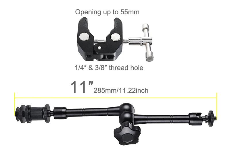 SUPER CLAMP-magic arm clamp имеет гнездо 1/4-20 и 3/8-16, оба стандартных размера фитинга в фотостудии для головок и штативов используется для различных насадок. Как камеры, 15 мм стержни, светодиодные фонари, зонты, крючки, полки, Пластины стекла, поперечные стержни и т. Д.