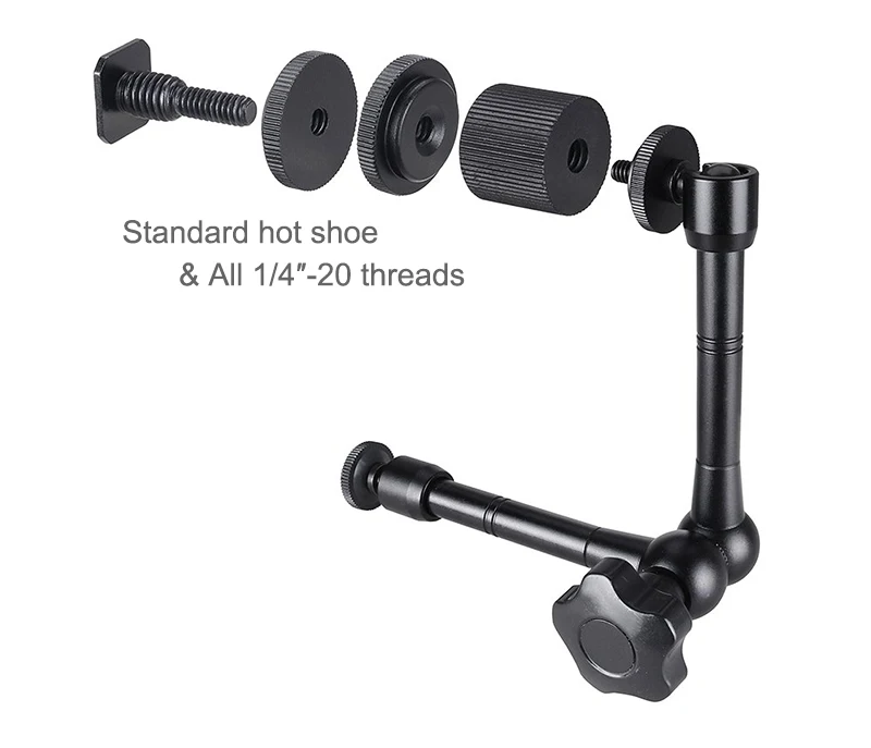MAGIC ARM-одна сторона имеет 1/4 "винт, соединяющийся с монитором, светодиодный светильник или другие аксессуары. Другая сторона-это квадратное крепление для горячего башмака, которое можно легко установить на камеру DSLR. И это крепление для горячего башмака является съемным, чтобы стать еще одним винтом 1/4 ", поэтому оба конца-винт 1/4", который вы можете подключить к различному оборудованию.