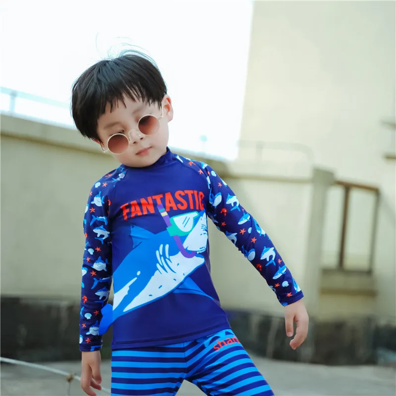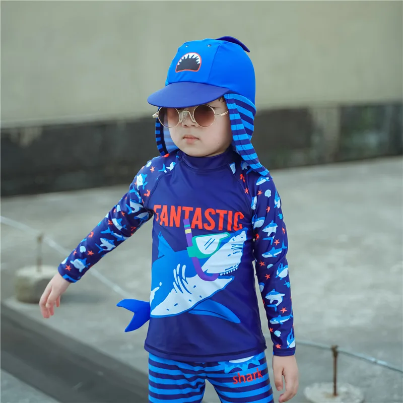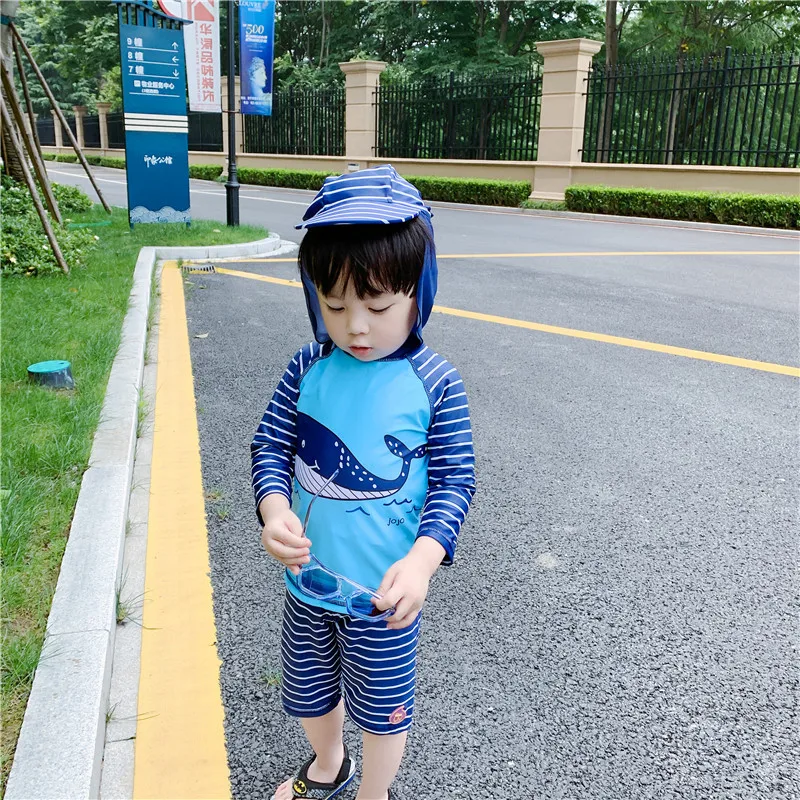 Детский купальник с защитой от УФ-лучей, купальный костюм для малышей, рубашка с длинными рукавами, плавки, шляпа, комплект для мальчиков 2-12 лет