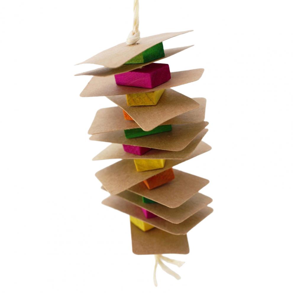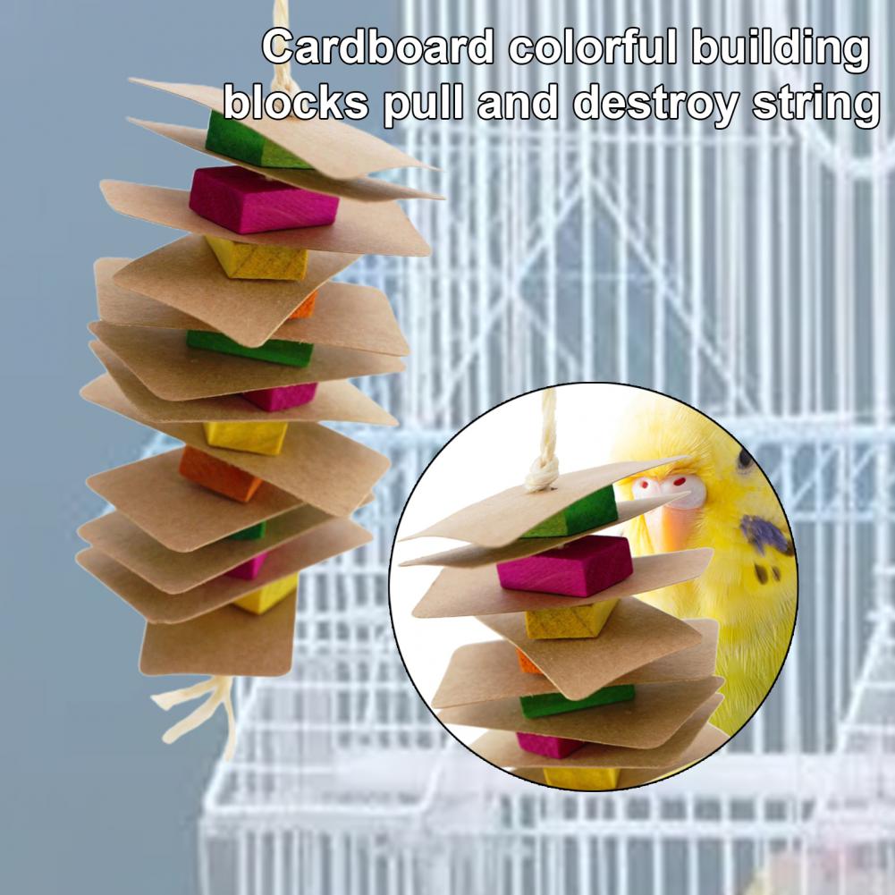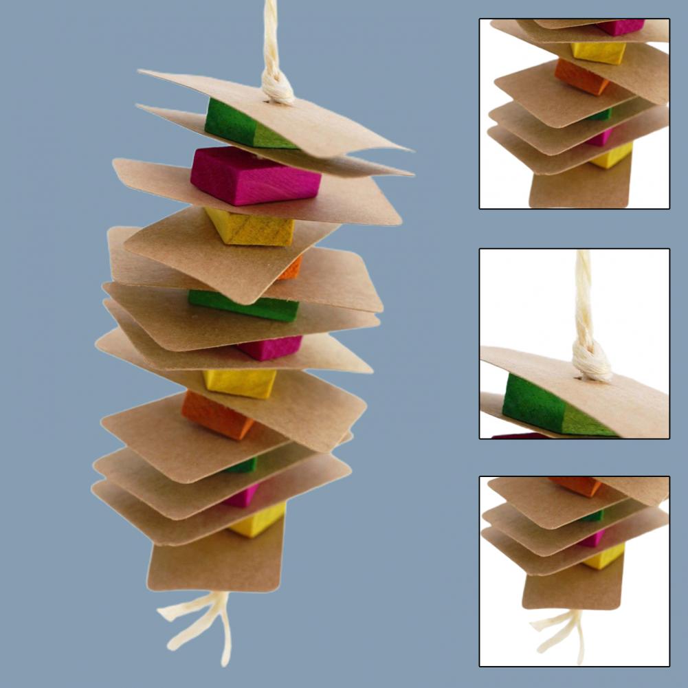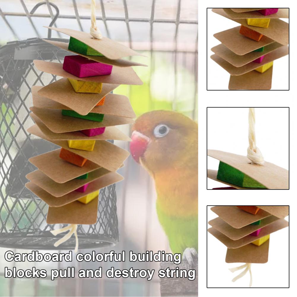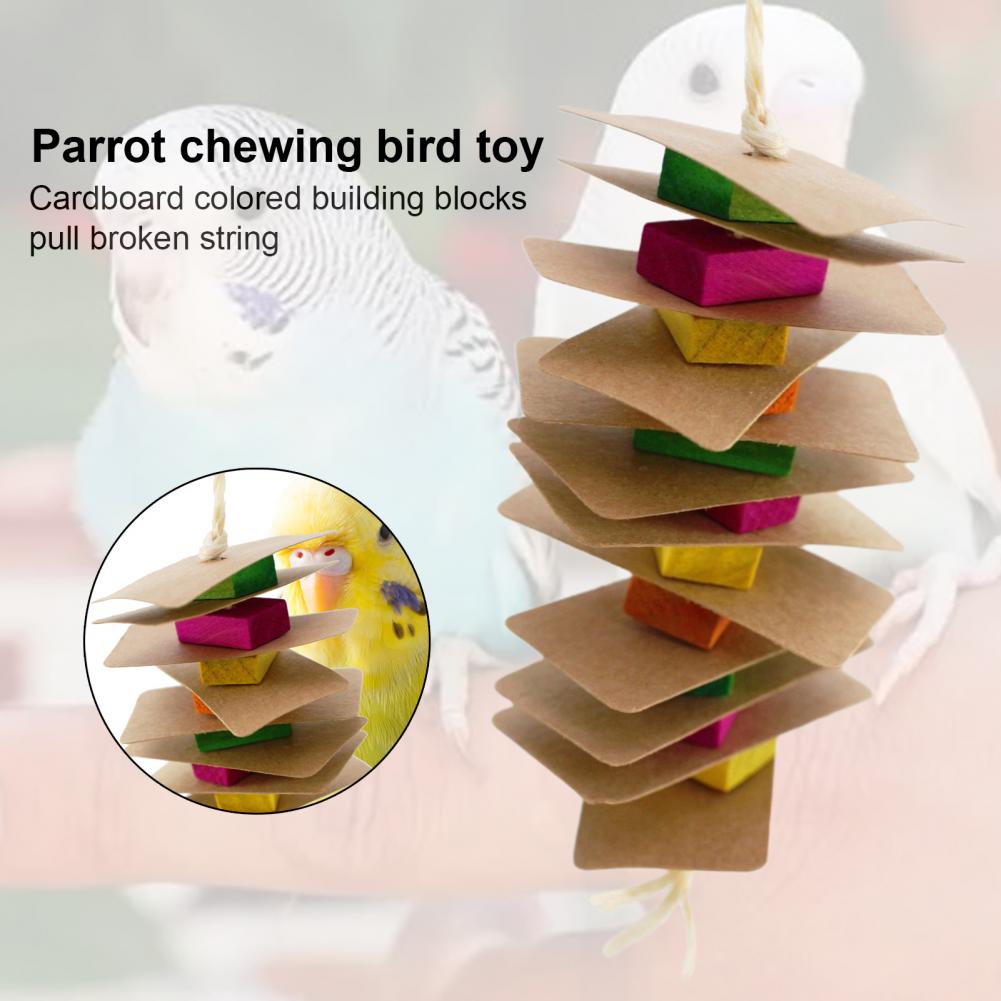 Благодаря цветным строительным блокам и дизайну картонных косынков игрушка попугая практична, многофункциональна и легко вызывает интерес питомца к жеванию и уменьшению агрессивности и одиночества.