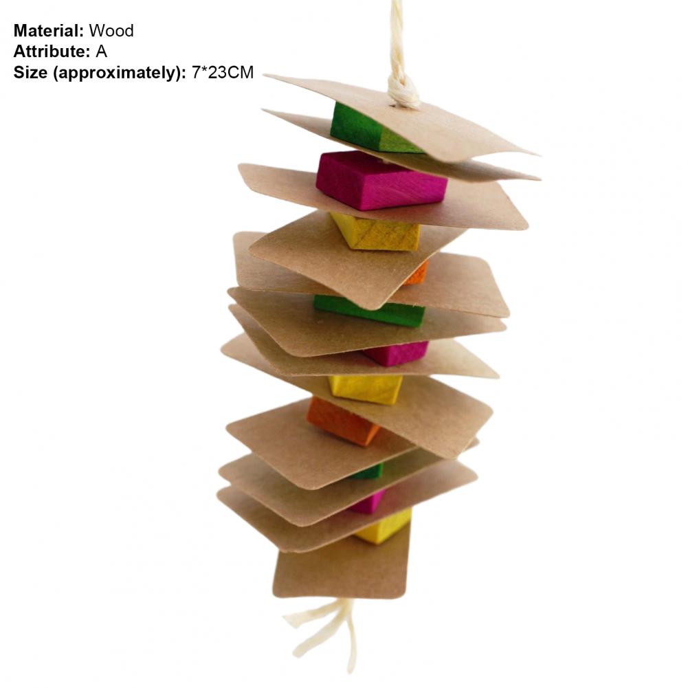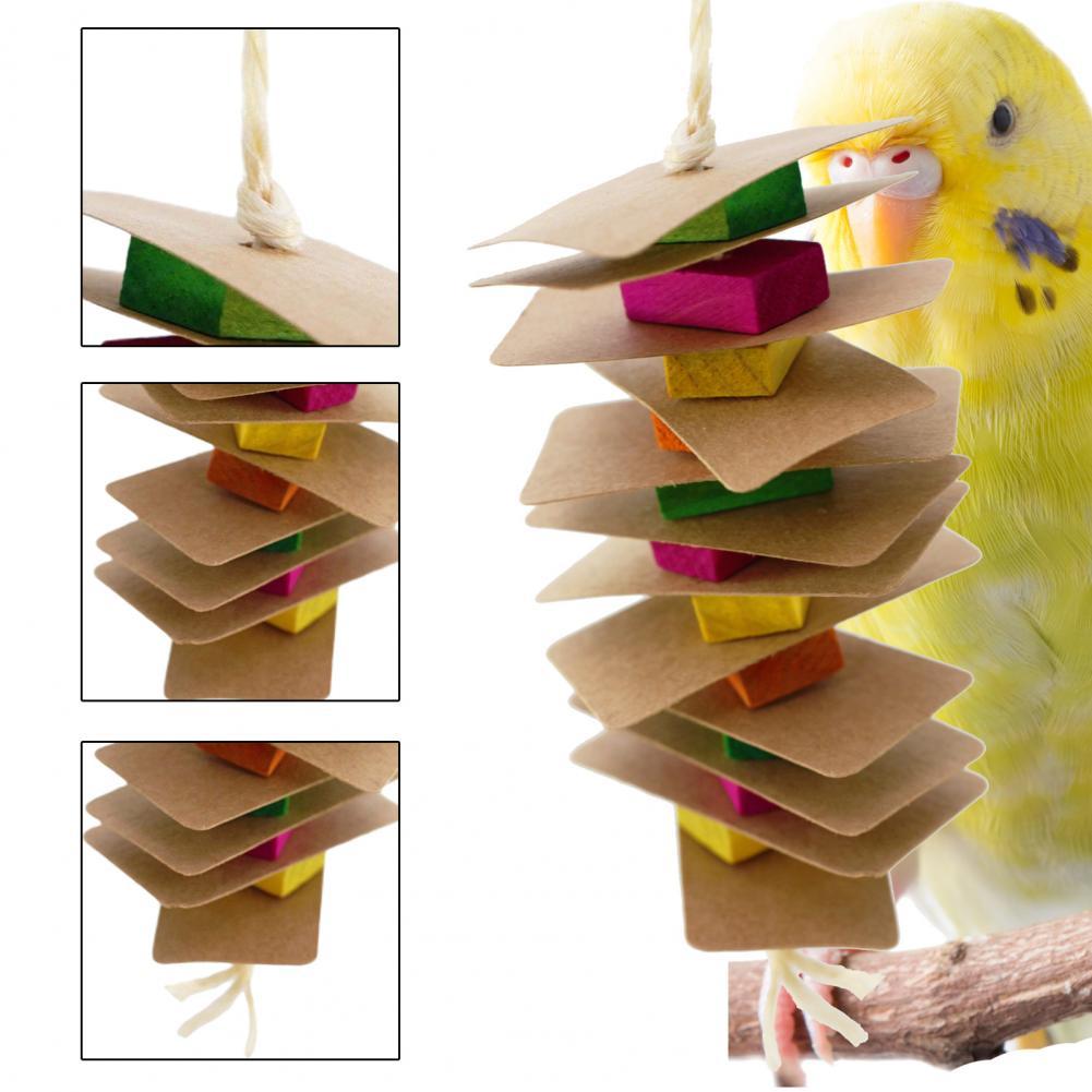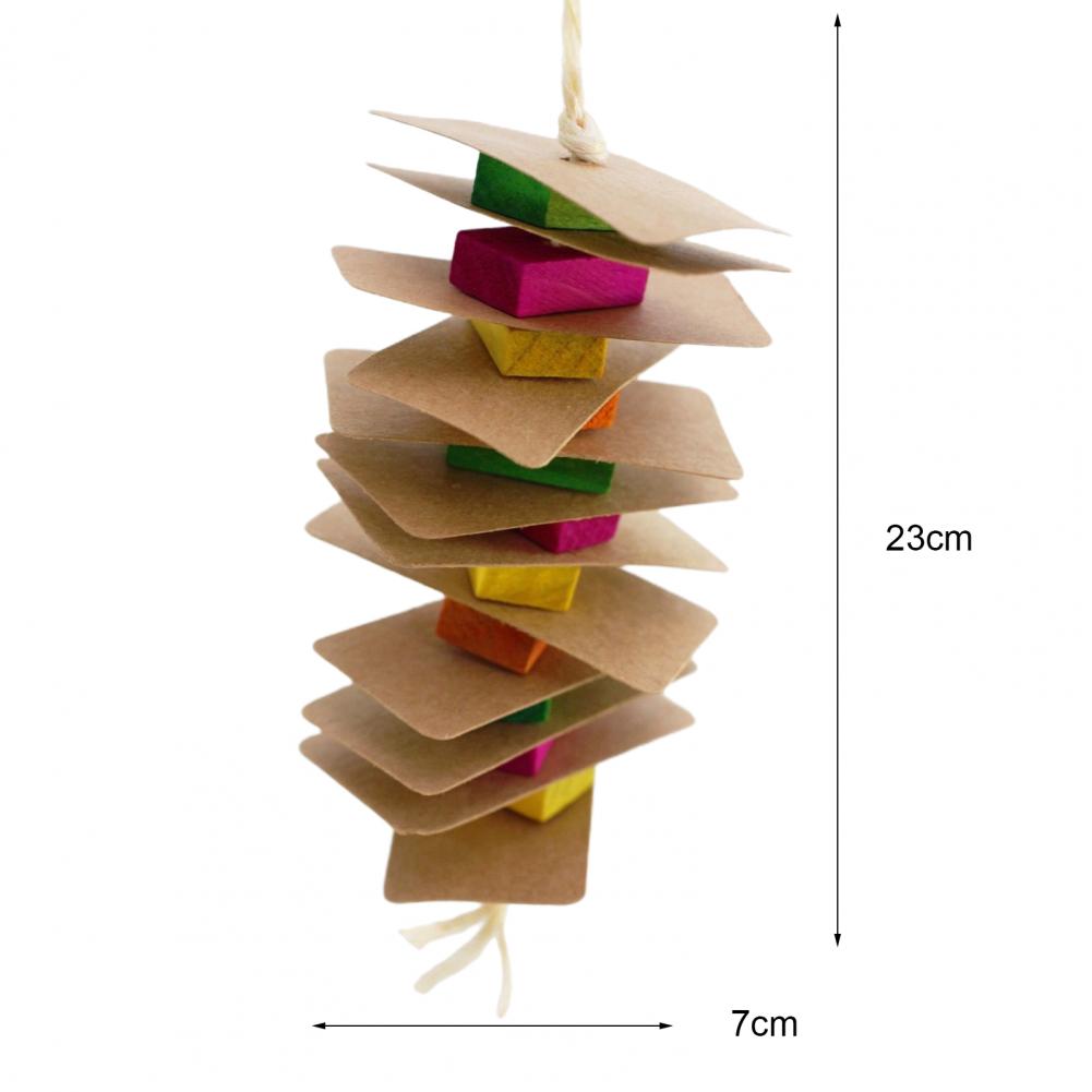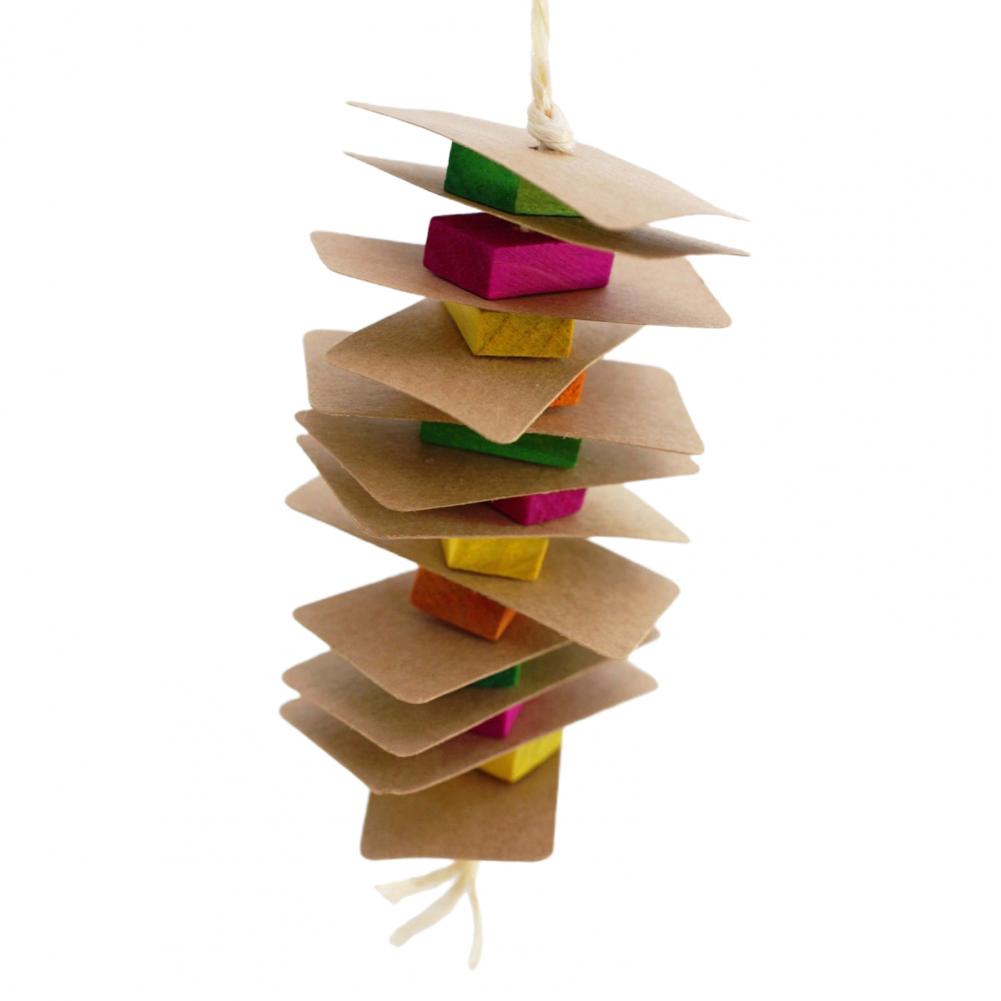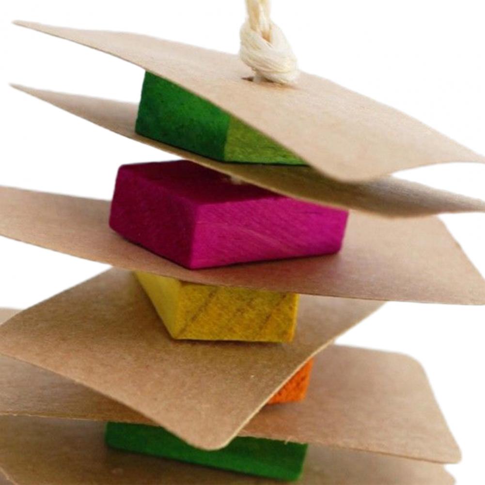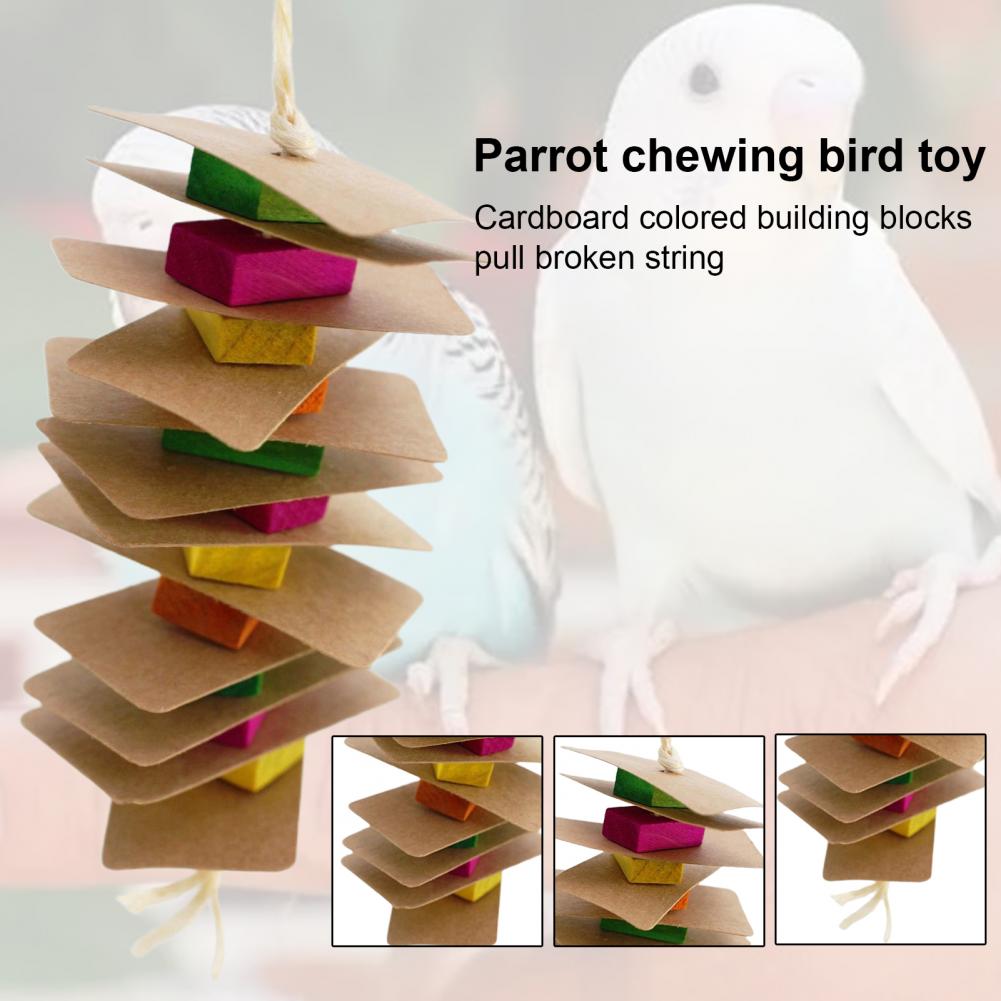 Благодаря цветным строительным блокам и дизайну картонных косынков игрушка попугая практична, многофункциональна и легко вызывает интерес питомца к жеванию и уменьшению агрессивности и одиночества.