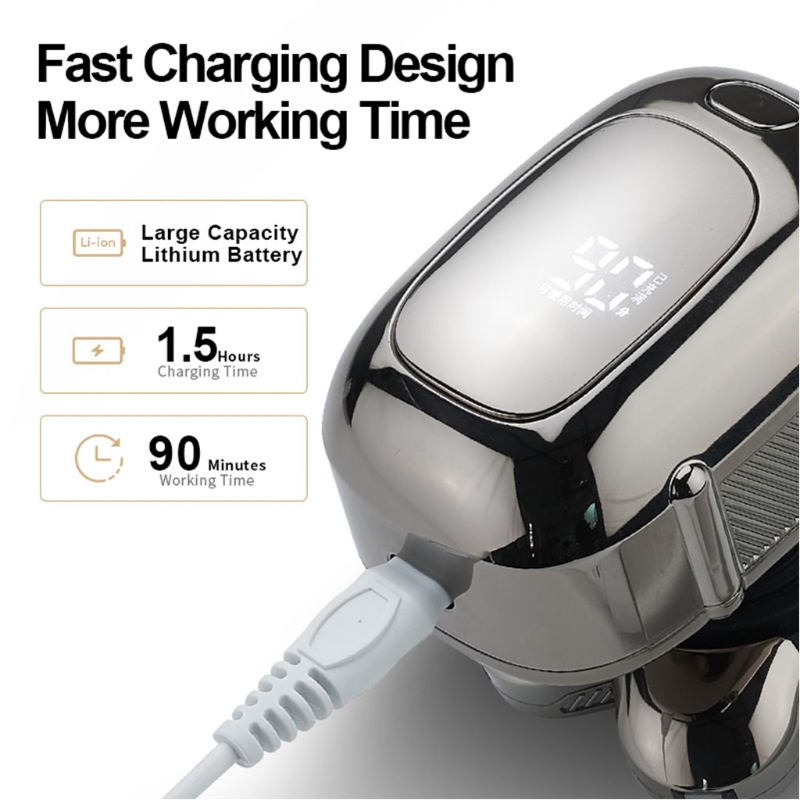 Характеристики: 1. Перезаряжаемый и прочный. Со встроенной литий-ионный Батарея, обеспечивает 90 минут для бритья с только 1,5 часов USB для быстрой зарядки. Интеллектуальный светодиодный дисплей показывает состояние батареи.