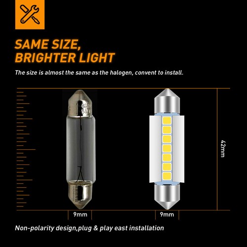 В этом списке есть пара супер ярких41 мм42 ммБелый Высокая мощность3030-SMD светодиодные лампы, специально разработанный, чтобы заменить укрыты внутренной сводной светильник лампы, Caubus построить в такой стране, как., легкая установка, просто прямая подключи и работай.