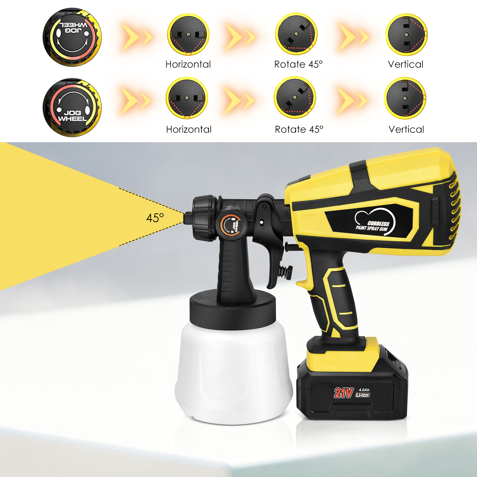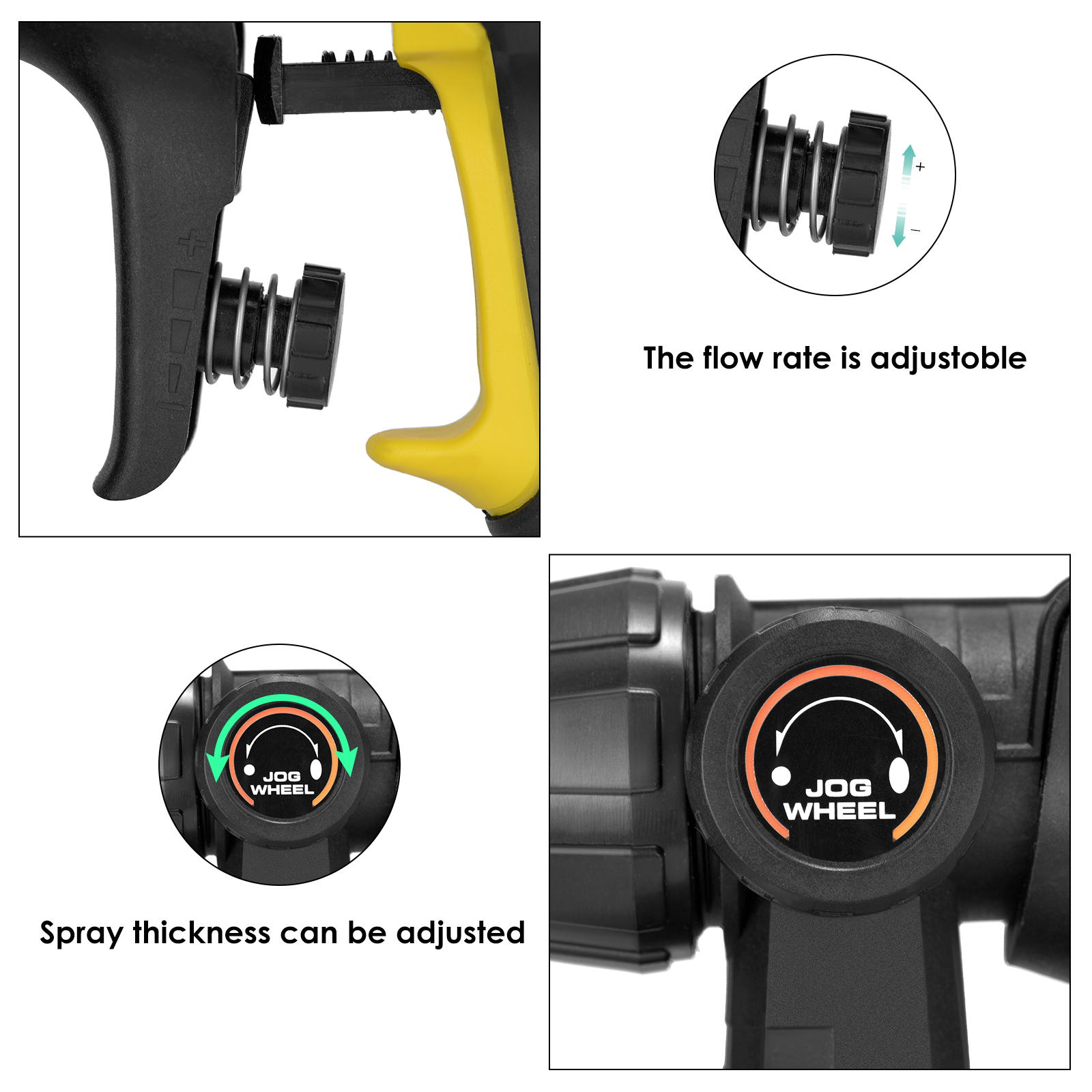 [3 метода распыления]Электрический распылитель оснащен 3 различными методами распыления (горизонтальное, вертикальное и круговое распыление). Поверните ручку сопла, чтобы отрегулировать форму распыления от кругового к вертикальному к горизонтальному. Сопло можно выбрать в соответствии с вязкостью цвета.