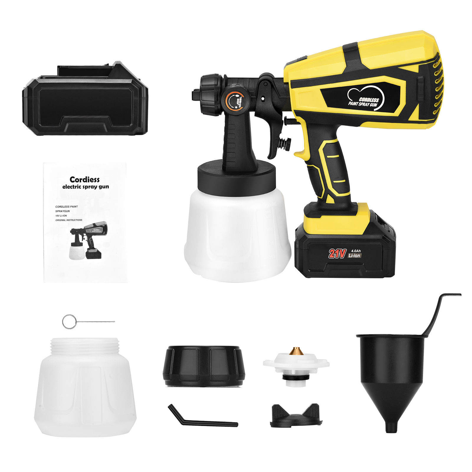1 x пистолет для распыления батареи. 1x4,0 Ah/21 V батарея. 1 зарядное устройство. 1 x контейнер 1000 мл. 1 Воронка. Руководство пользователя на английском языке-1 шт.