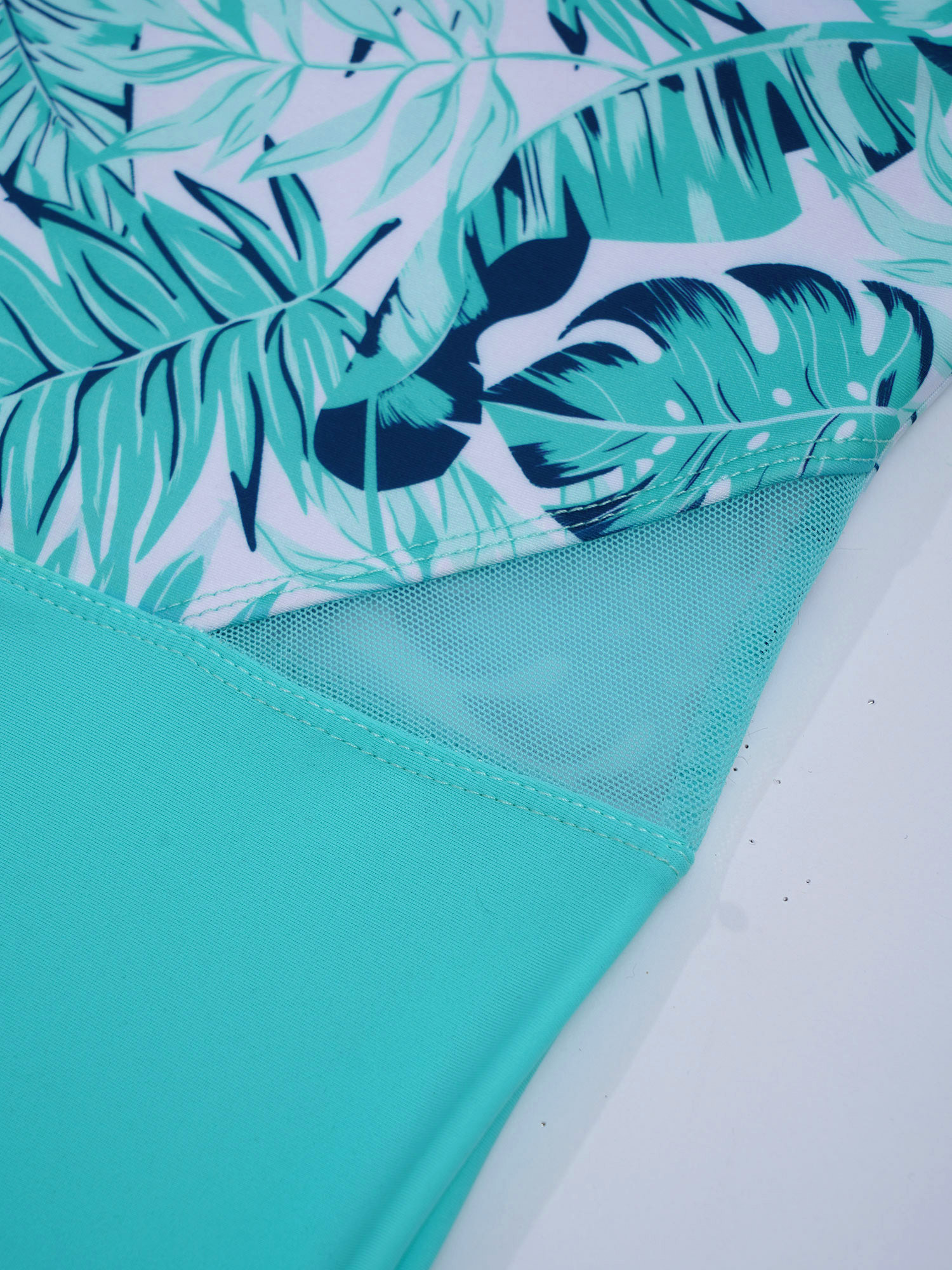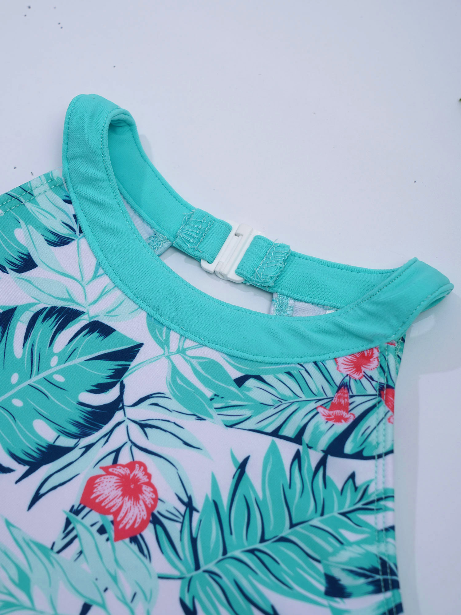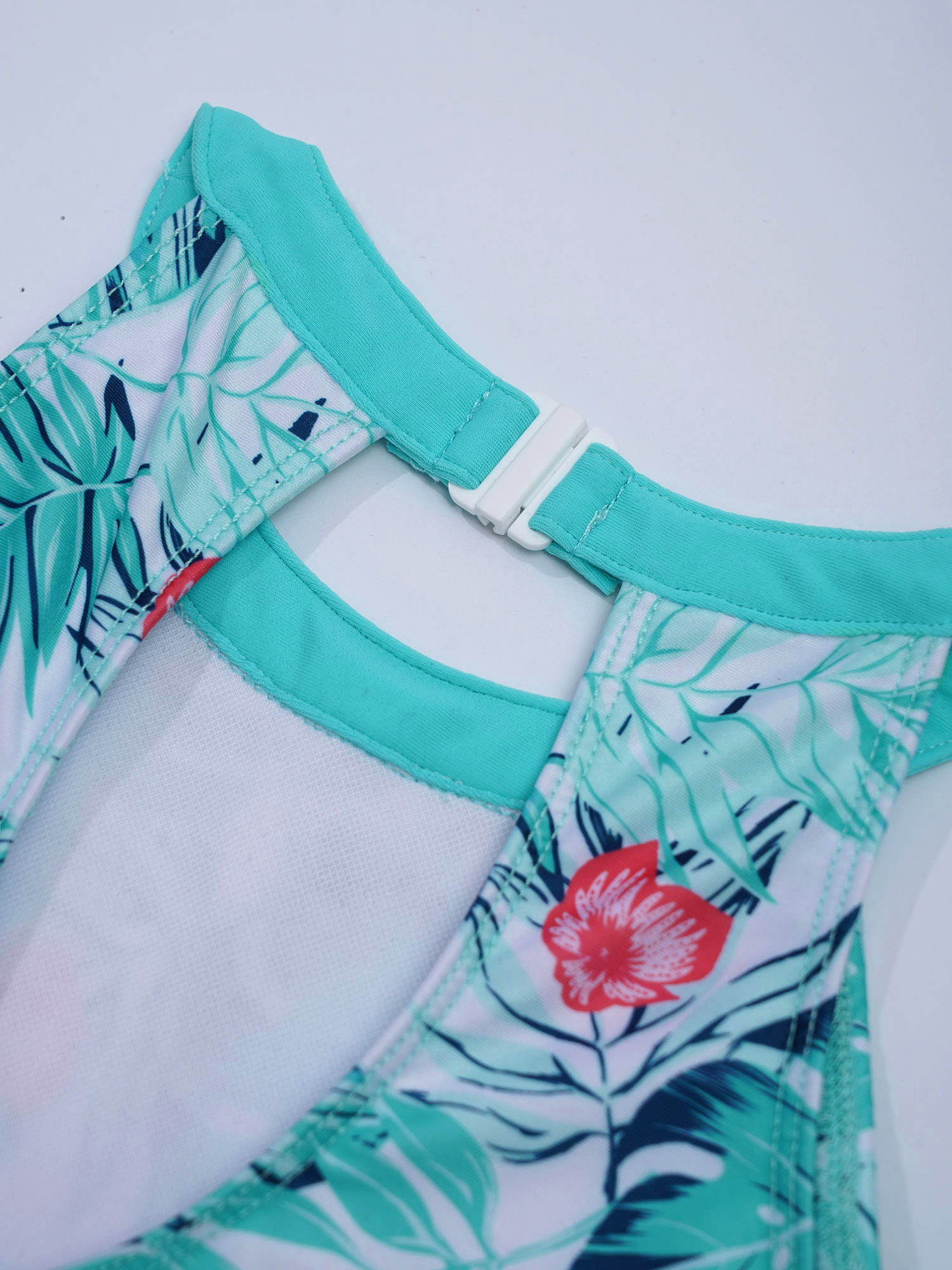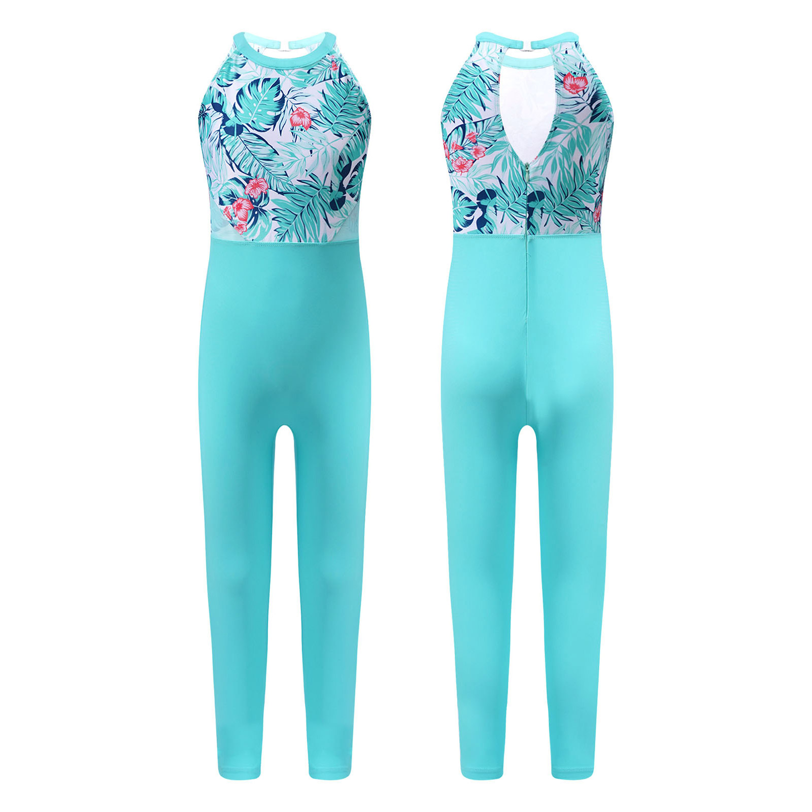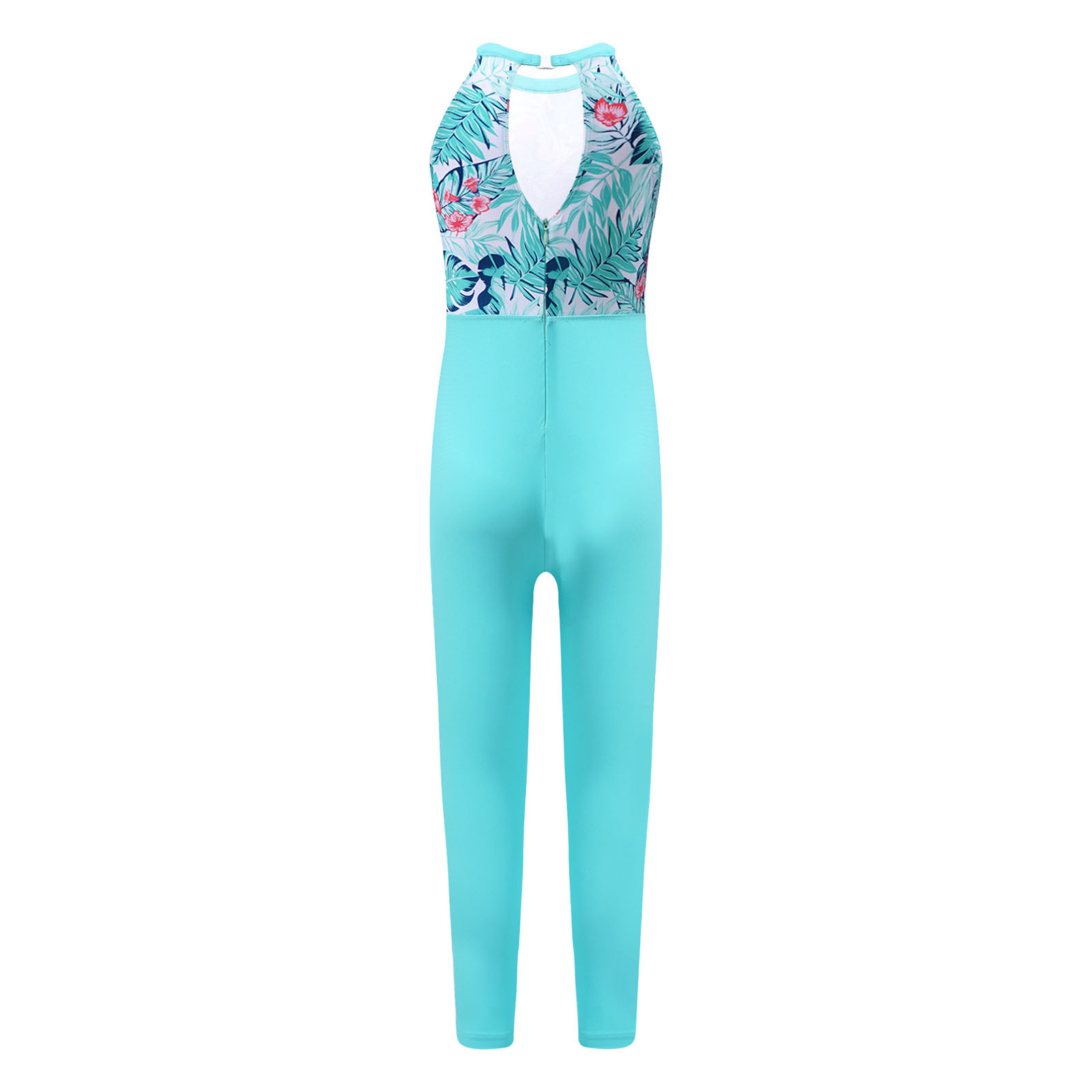 Kids girls one-piece print jumpsuit halter sleeveless backless mesh patchwork full length leotards for work out.