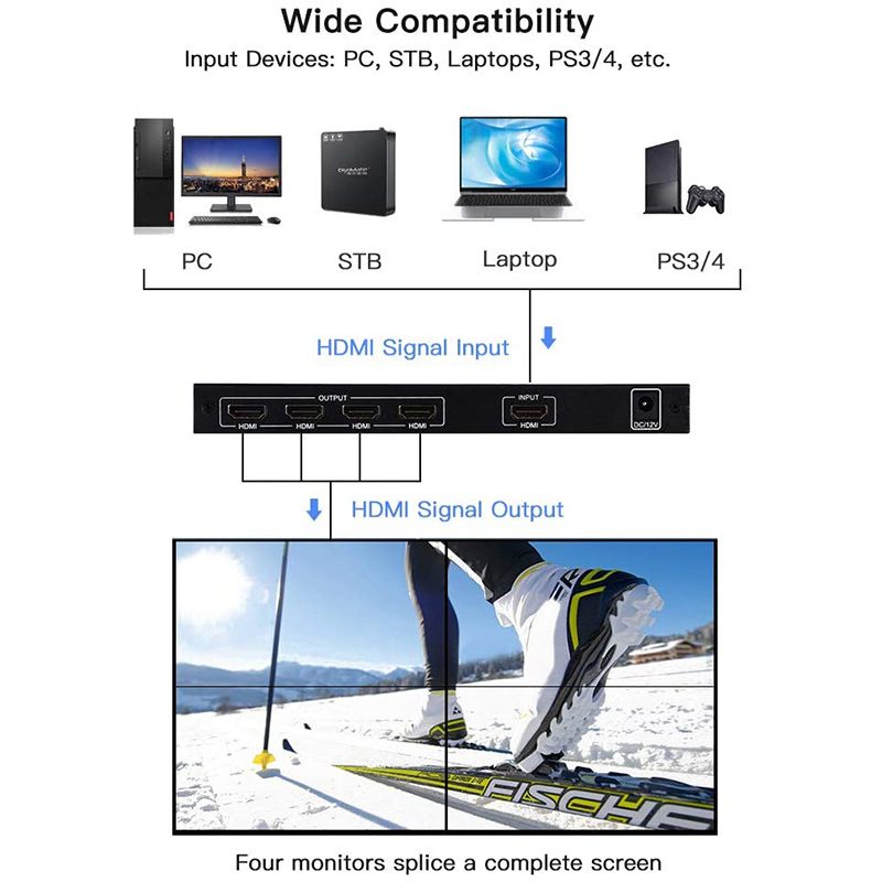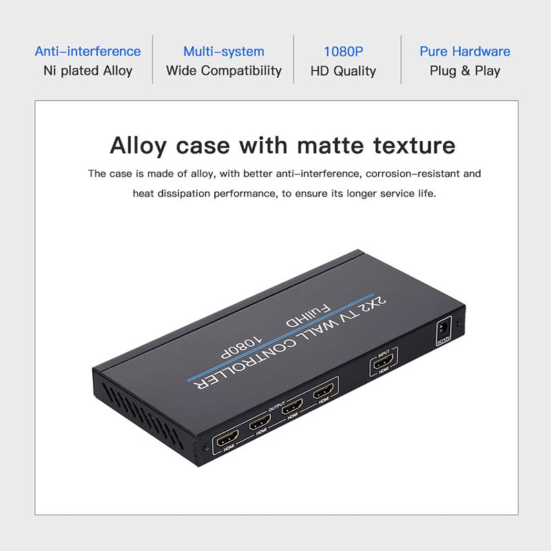 4. Стабильная производительность. Независимый чип используется для обеспечения стабильной работы устройства без задержек и искажений. Поддерживает 1 вход и 4 выхода, а также поддерживает разрешение 1920*1080P @ 60 Гц для обеспечения высокого цвета, четкого и тонкого экрана.