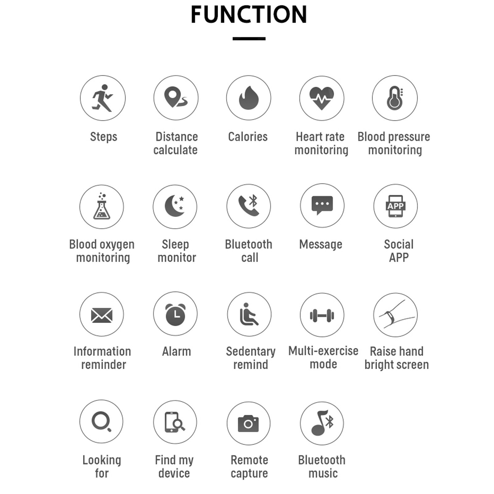 1,69 дюйма Цветной TFT-экран с высокой чувствительностью и однонаправленным управлением, который может Реализуйте различные операции. Поддержка Уведомление о звонках и сообщениях, важная информация не будет пропущена. IP67 Водонепроницаемый для повседневной жизни, мультиспортивный режим, подходит для занятий спортом на открытом воздухе. Автоматическая запись ежедневных шагов движения и данных о калориях. Поддержка Пульс, артериальное давление, мониторинг кислорода в крови, мониторинг сна Функция, когда вы засыпаете, он будет автоматически контролировать качество Сон и запись данных в приложении. Функции: Настройка будильника, напоминание о сидячем положении, монитор сердечного ритма, шагомер, сон Монитор, напоминание о звонках/сообщениях, Поиск телефона, поднятие руки светильник Ки, Удаленная камера и многое другое. Зарядка С зарядным кабелемСпецификация: