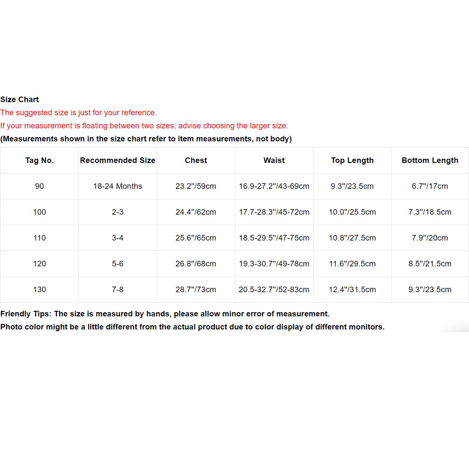 Номер бирки Рекомендуемый размер Грудь Талия Длина верха Длина низа 90 18-24 месяцев 23,2 ''/59 см 16,9-27,2 ''/43-69 см 9,3 ''/23,5 см 6,7 ''/17 см 100 2-3 24,4 ''/62 см 17,7-28,3 ''/45-72 см 10,0 ''/25,5 см 7,3 ''/18,5 см 110 3-4 25,6 ''/65 см 18,5-29,5 ''/47-75 см 10,8 ''/27,5 см 7,9 ''/20 см 120 5-6 26,8 ''/68 см 19,3-30,7 ''/49-78 см 11,6 ''/29,5 см 8,5 ''/21,5 см 130 7-8 28,7 ''/73 см 20,5-32,7 ''/52-83 см 12,4 ''/31,5 см 9,3 ''/23,5 смПолезные советы: Замеры делаются вручную, поэтому учитывайте небольшие погрешности.