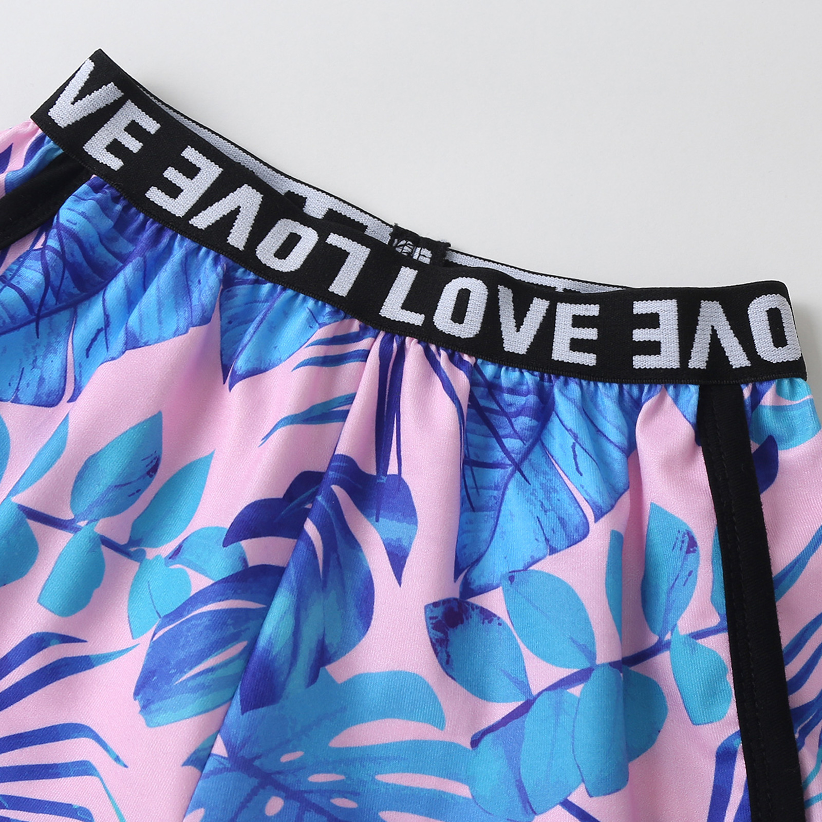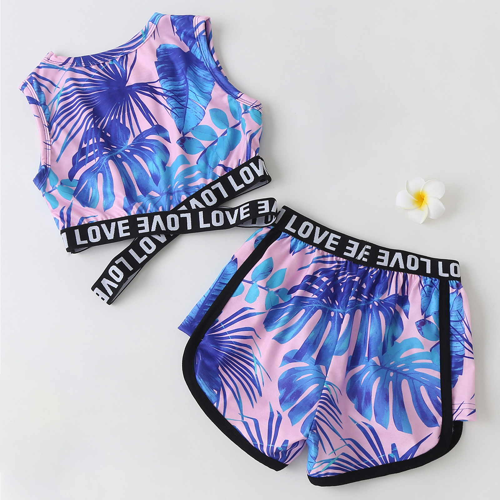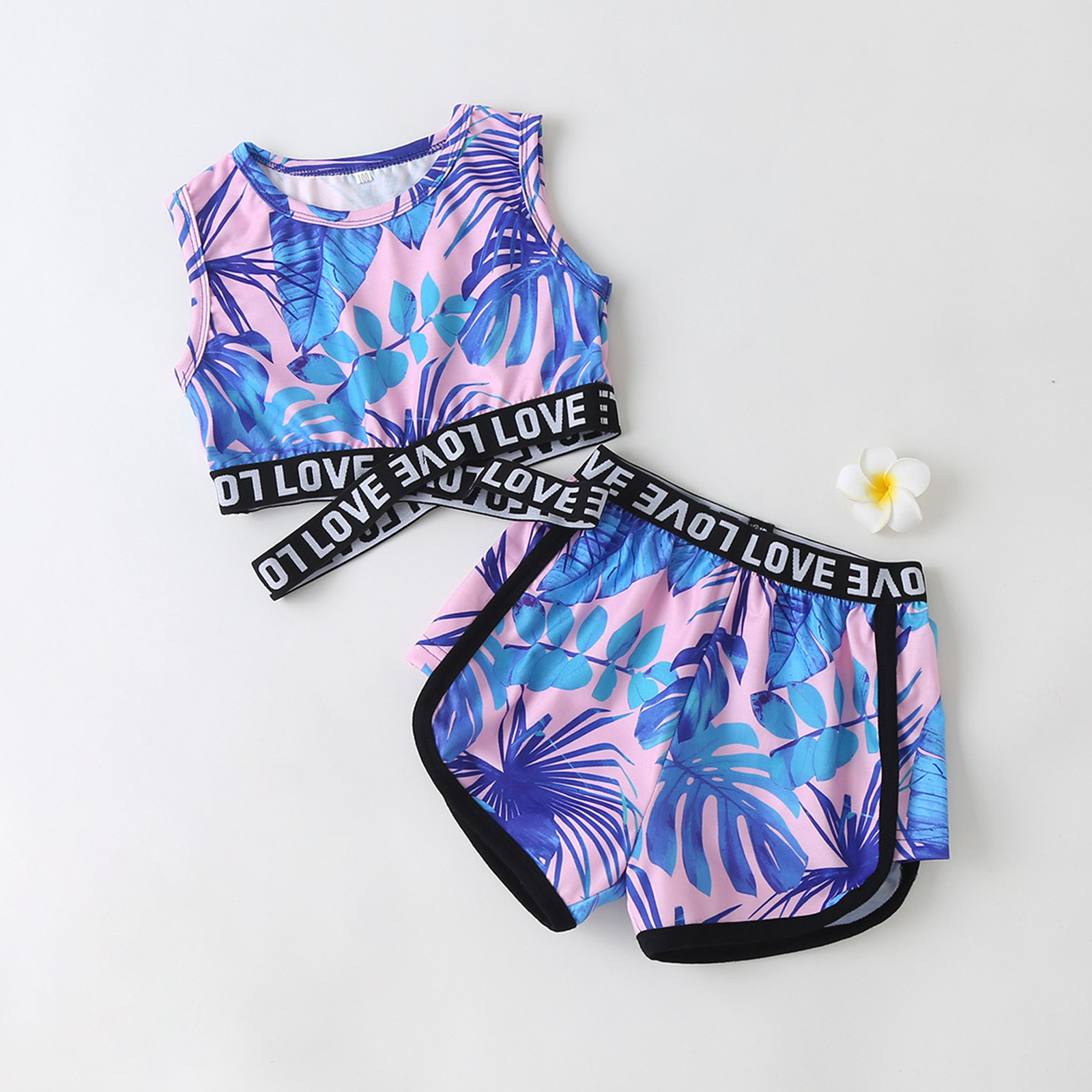 Детский комплект из топа с круглым вырезом без рукавов с принтом в виде листьев и букв и шорт с эластичной резинкой на талии для девочек.