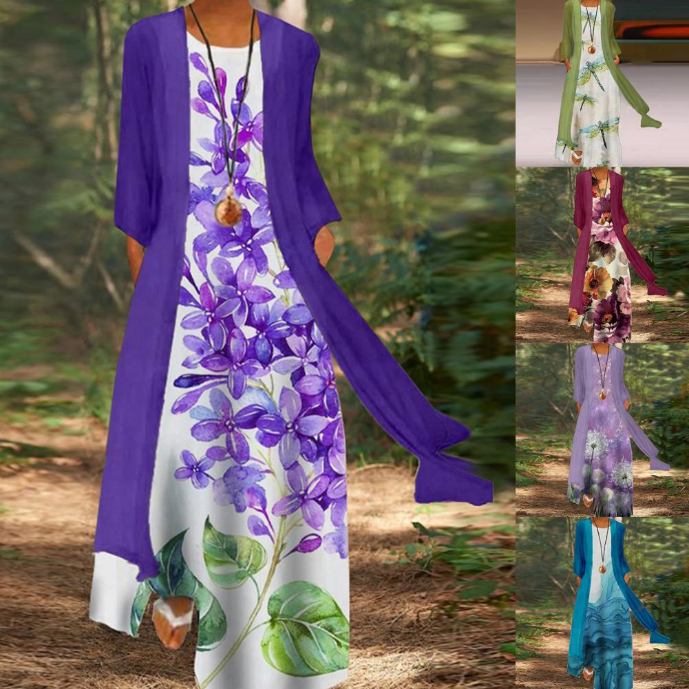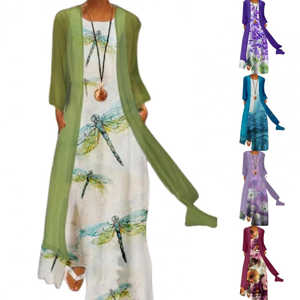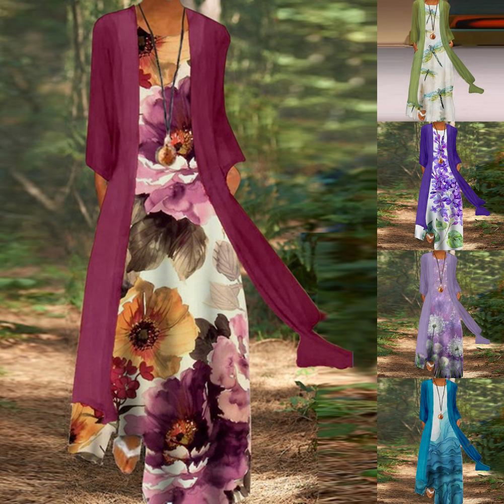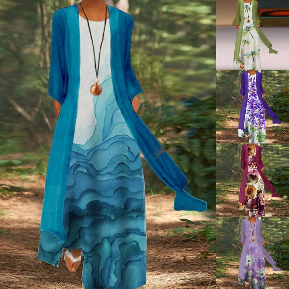 1 комплект, кардиган, платье, комплект, цветочный принт, Длинная женская Свободная верхняя одежда, без рукавов, с большим подолом, платье для повседневной носки, халат, женское, элегантное, повседневное