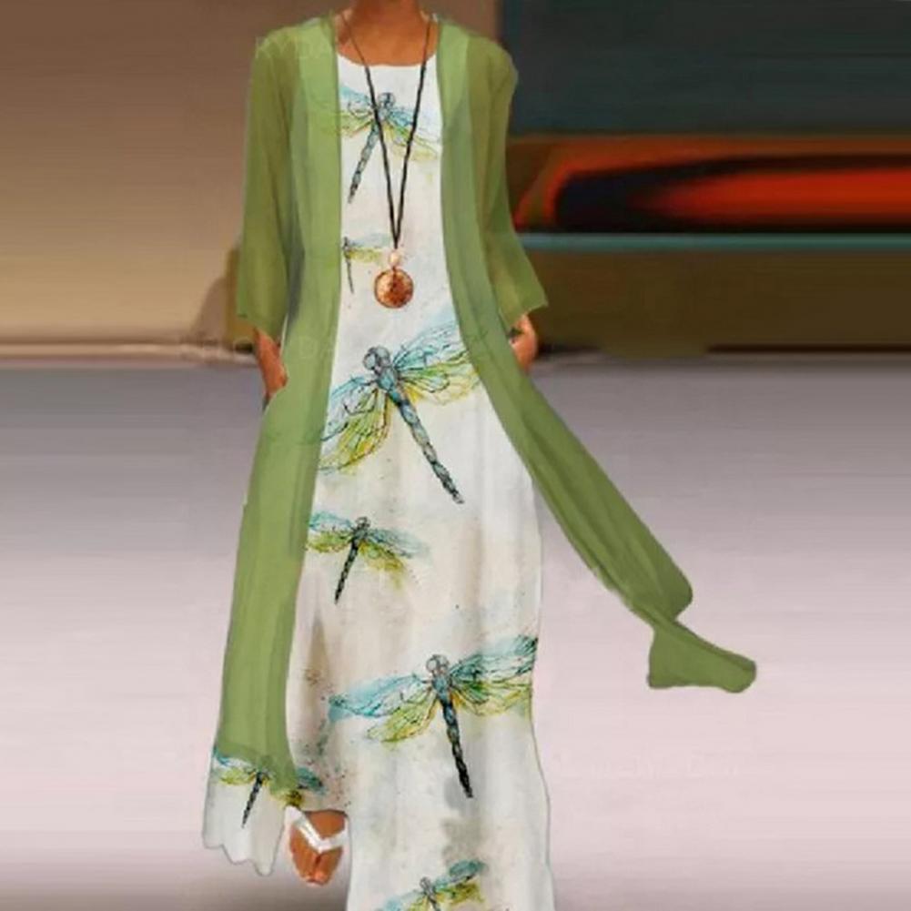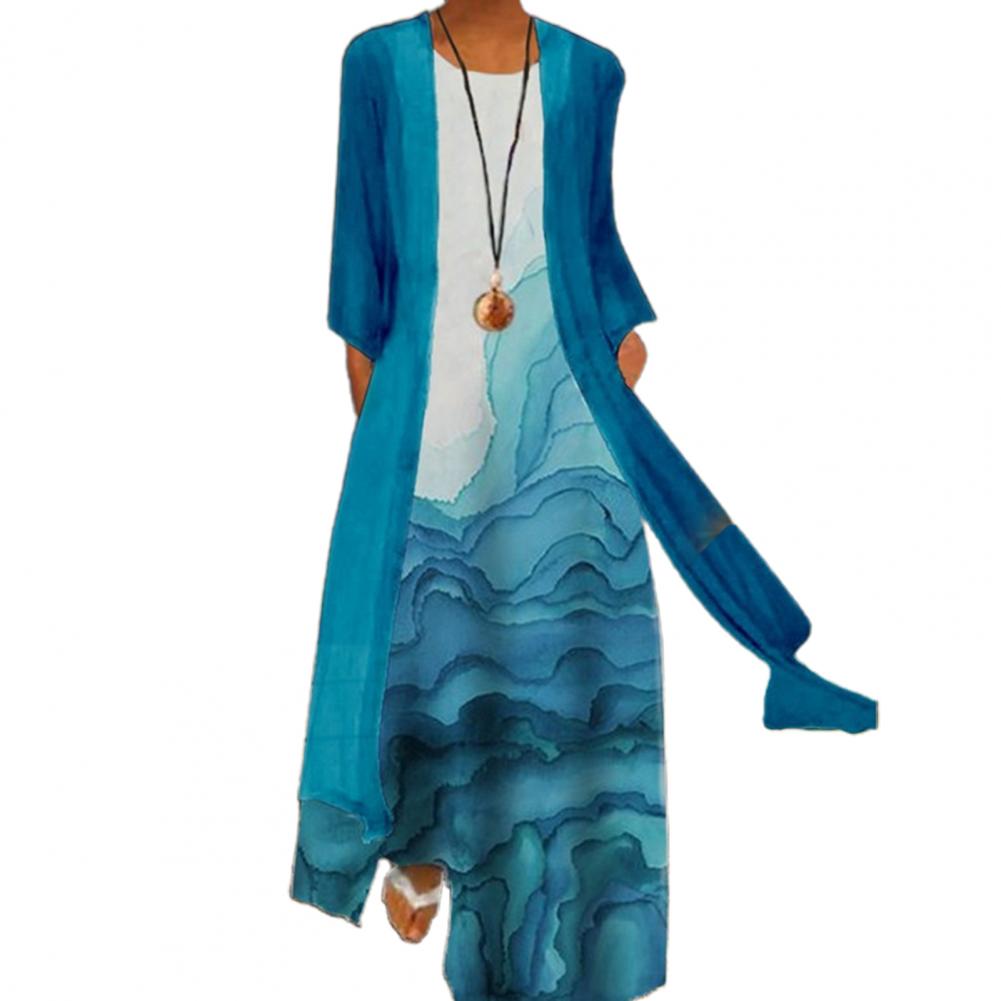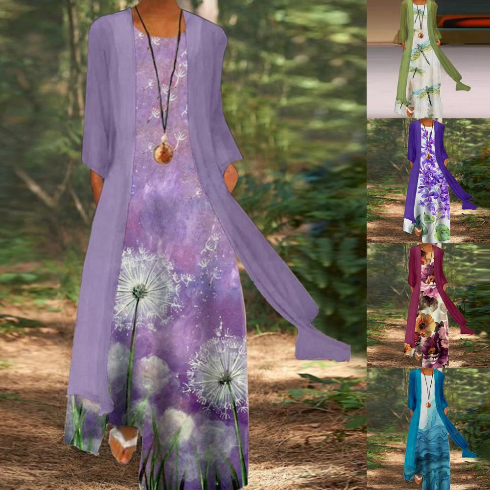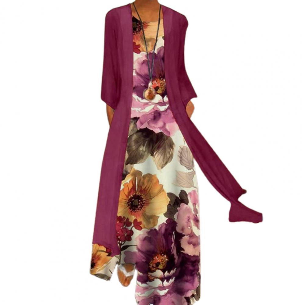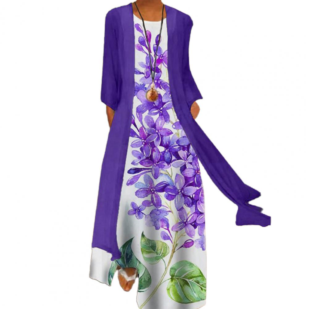 1 комплект, кардиган, платье, комплект, цветочный принт, Длинная женская Свободная верхняя одежда, без рукавов, с большим подолом, платье для повседневной носки, халат, женское, элегантное, повседневное