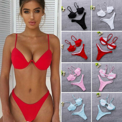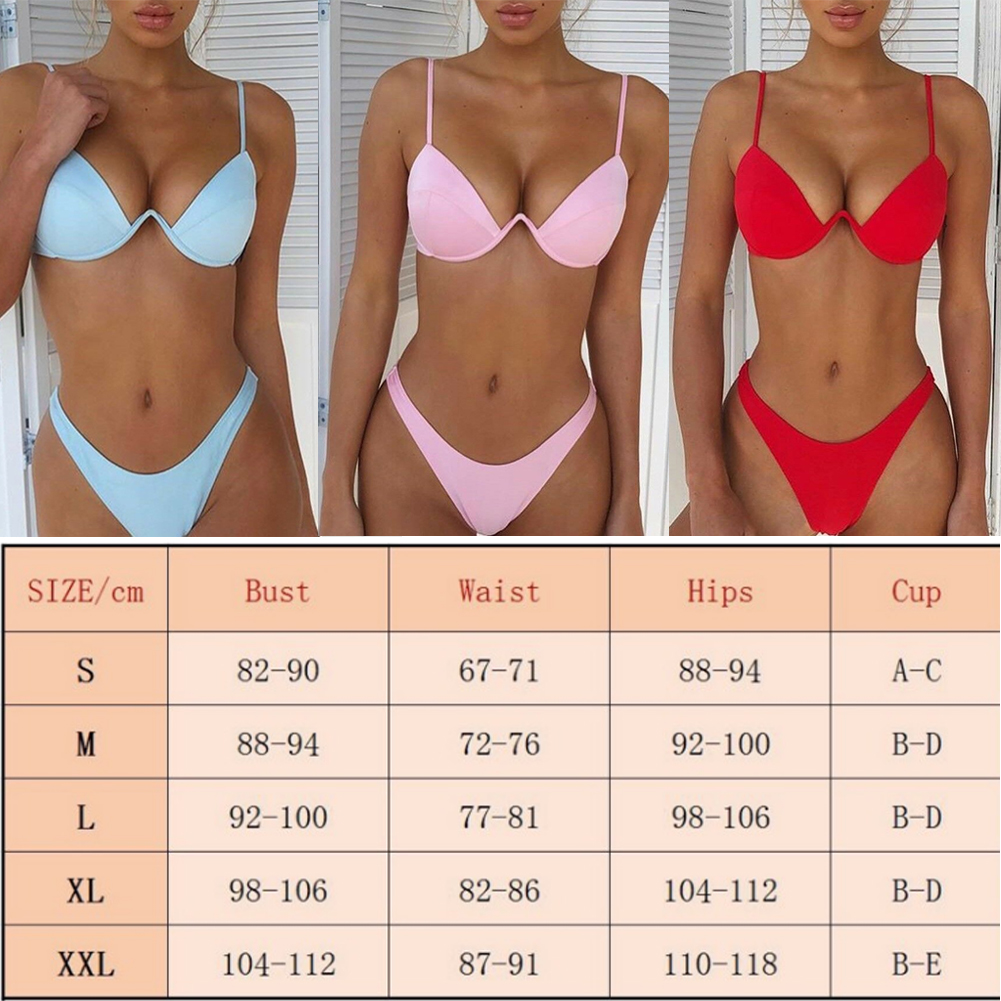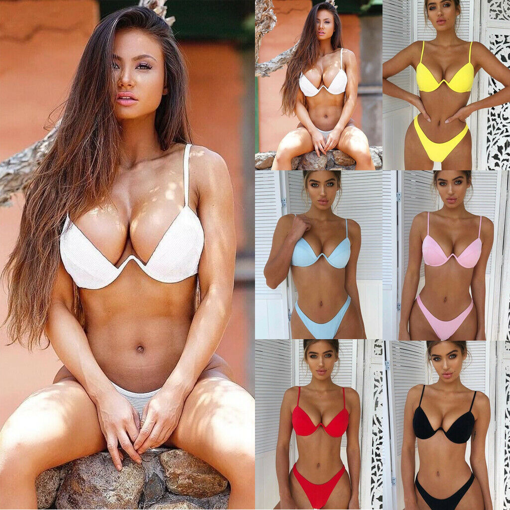 Женский комплект бикини из 2 предметов, однотонный бюстгальтер с v-образной пряжкой на спине, треугольные трусы с высокой талией, летний купальник