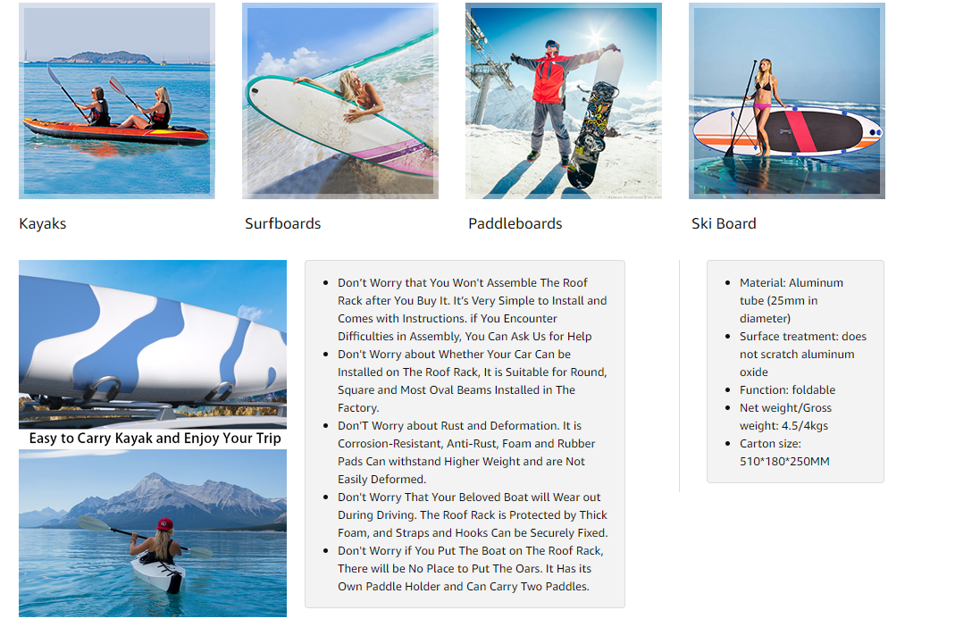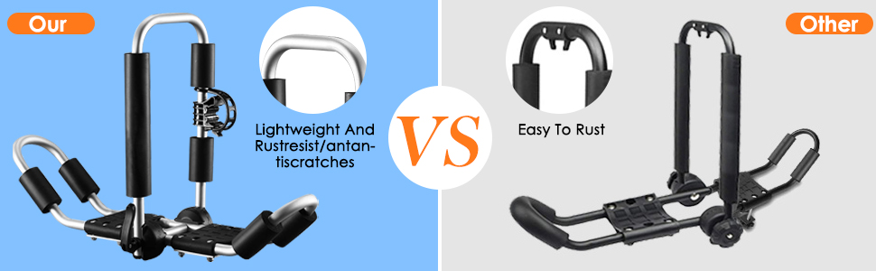 【 100% высококачественный алюминиевый материал и легкое Качество 】 весь корпус стойки Каяка изготовлен из алюминиевого материала, поверхность которого не будет зависеть от солнца или соленой воды, также не легко царапать, полностью отвечает тем, у кого есть определенные требования к эстетике. И уменьшить сложность установки, если у вас есть громоздкая стойка, вам может понадобиться второй человек, который поможет вам установить.
