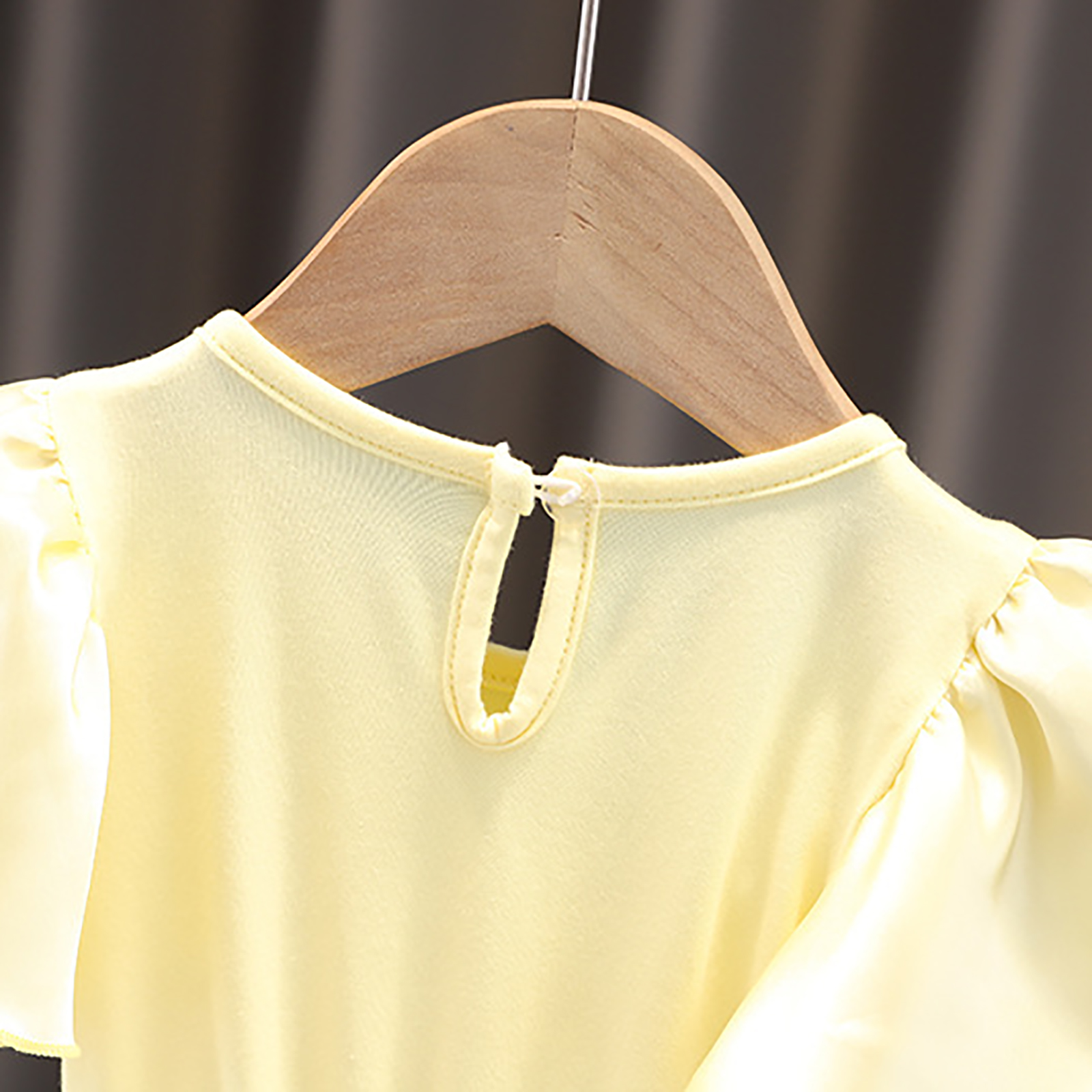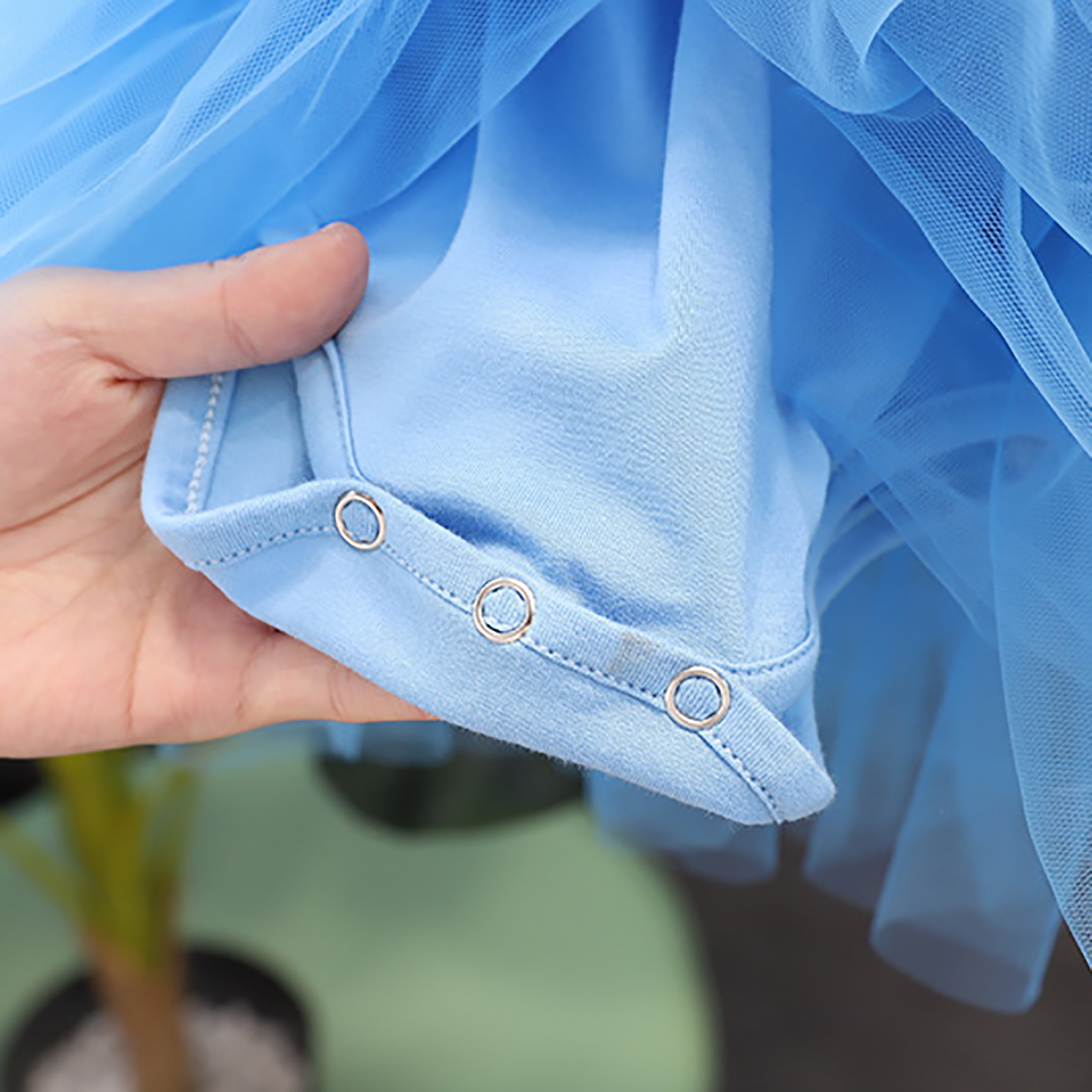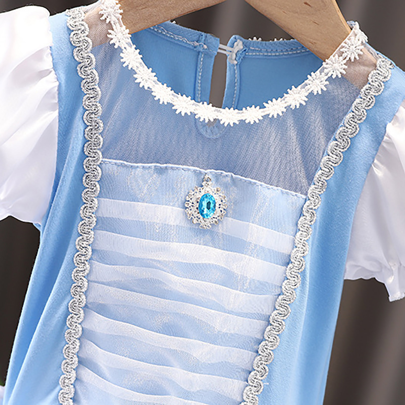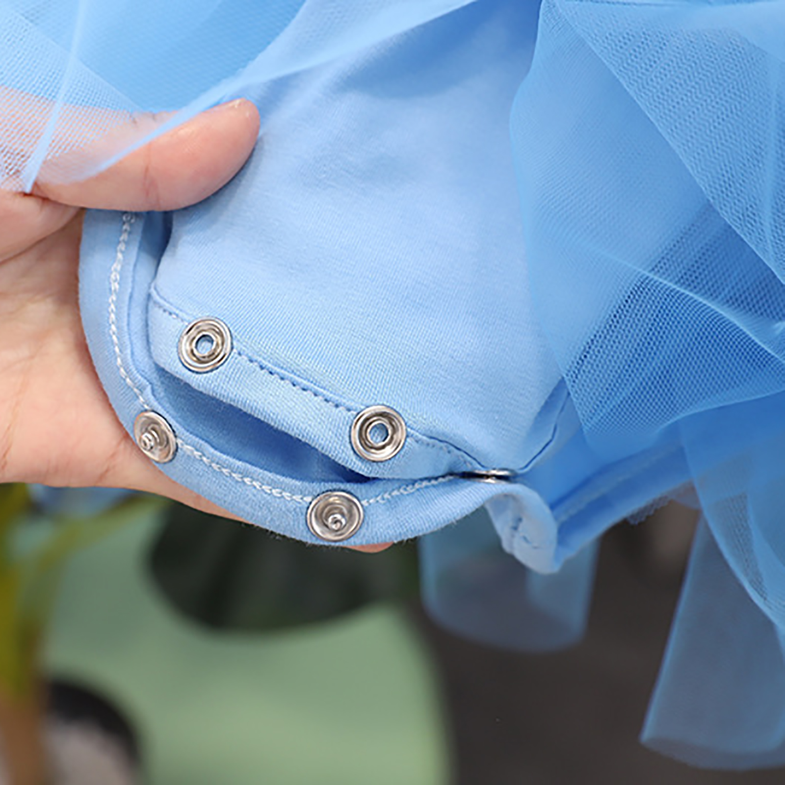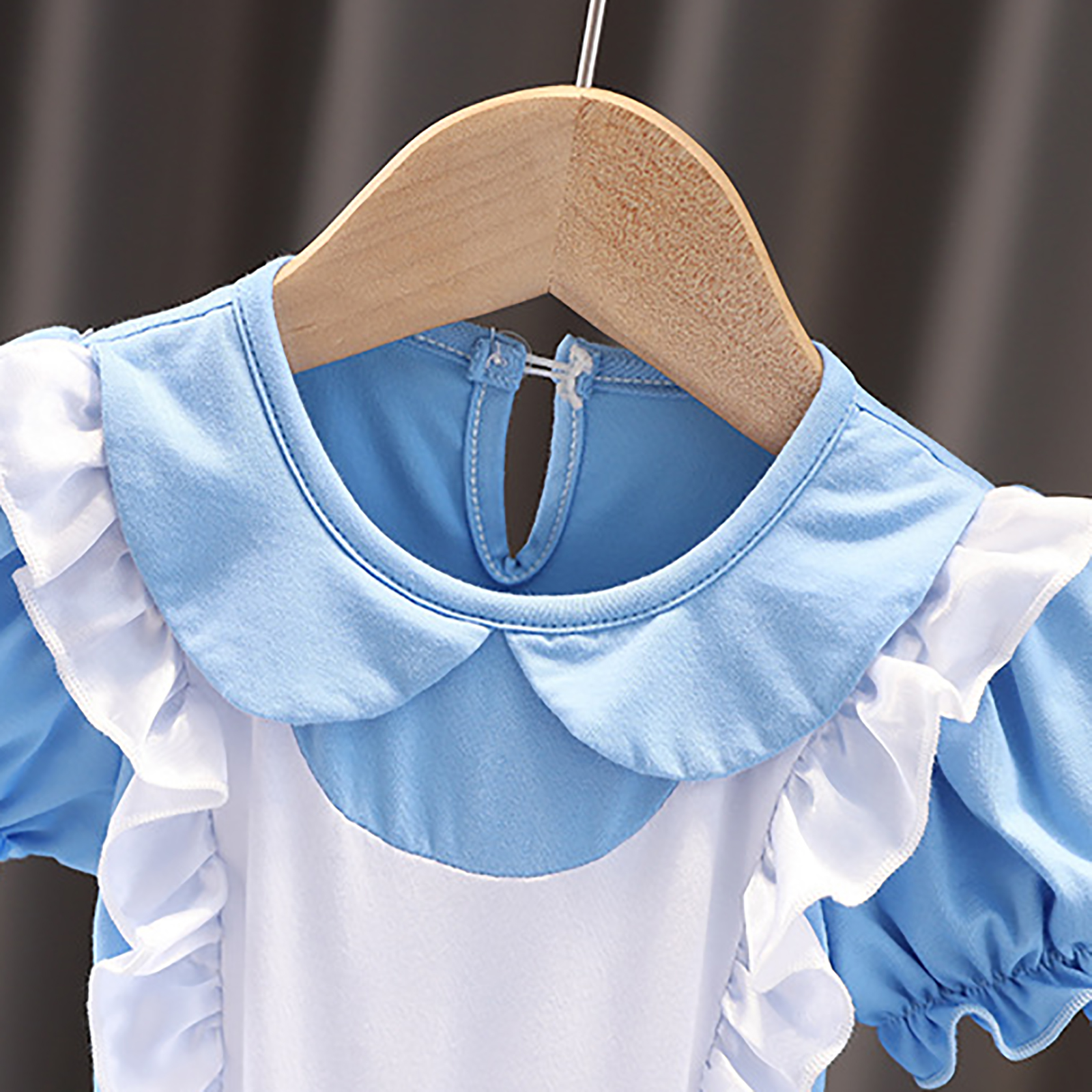Цельнокроеное платье-пачка с круглым вырезом, короткими рукавами с оборками, застежкой на одну пуговицу сзади, трусиками с тремя металлическими кнопками, которые легко надевать и снимать.