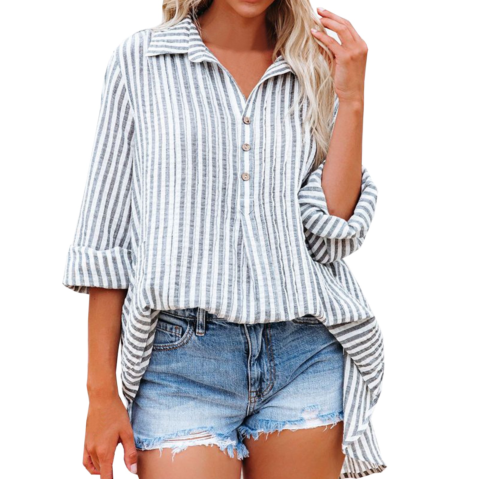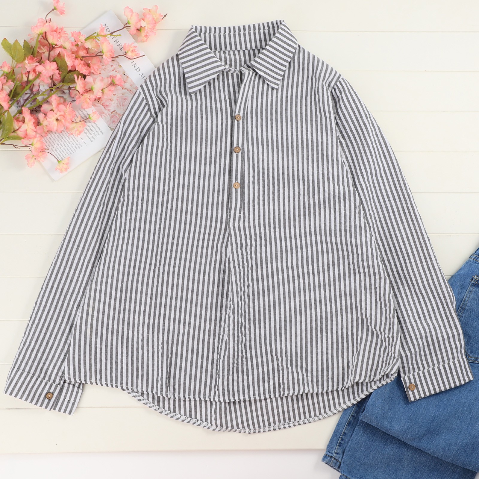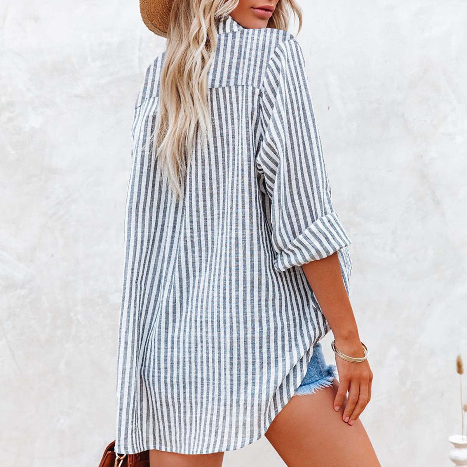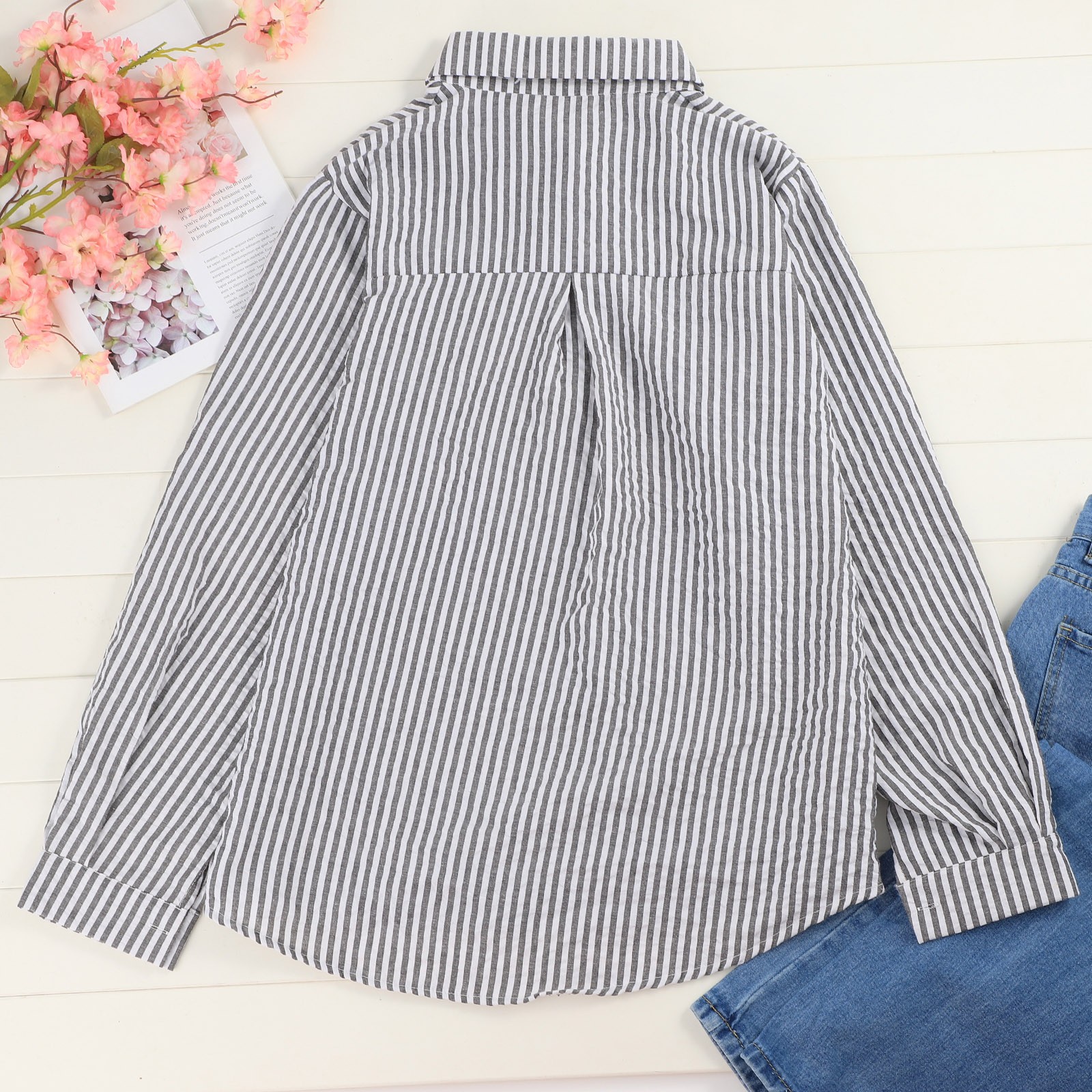2.Женский Повседневный полосатый Свободный пуловер с отворотом, рубашка с длинным рукавом,Подходит для весны, осени