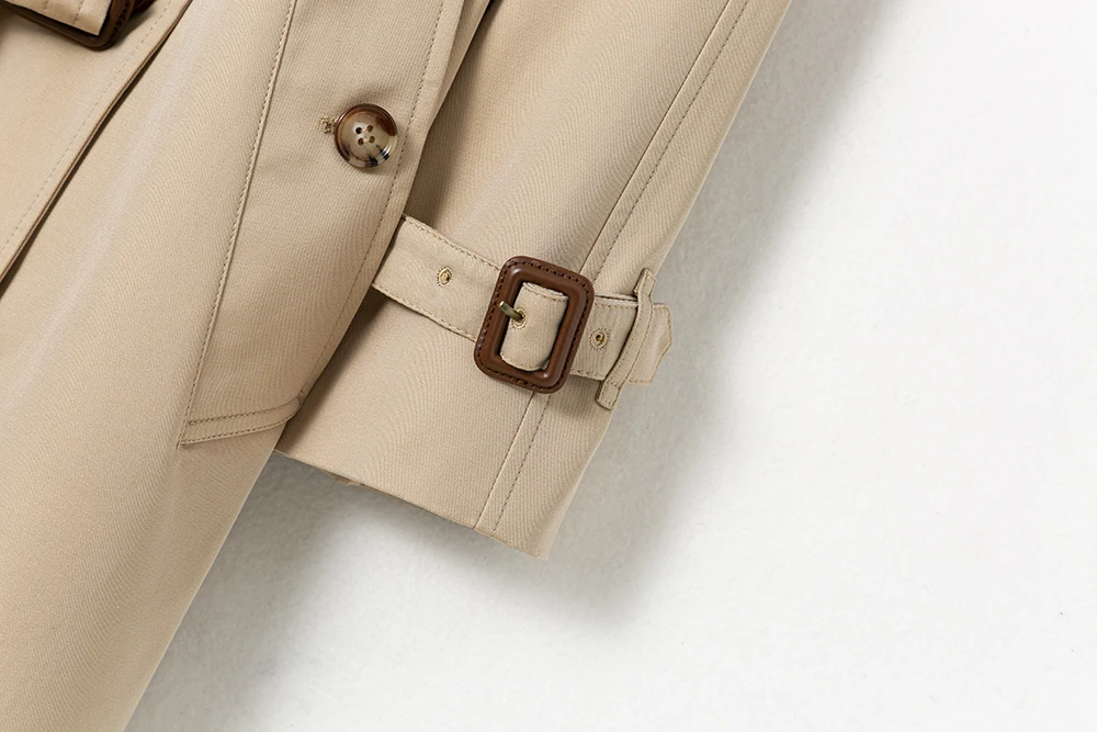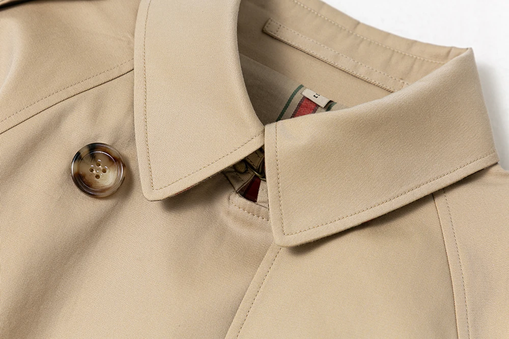 Signature details: epaulettes, hook-and-eye collar closure, gun flap, belted cuffs, D-ring belt, check undercollar, storm shield