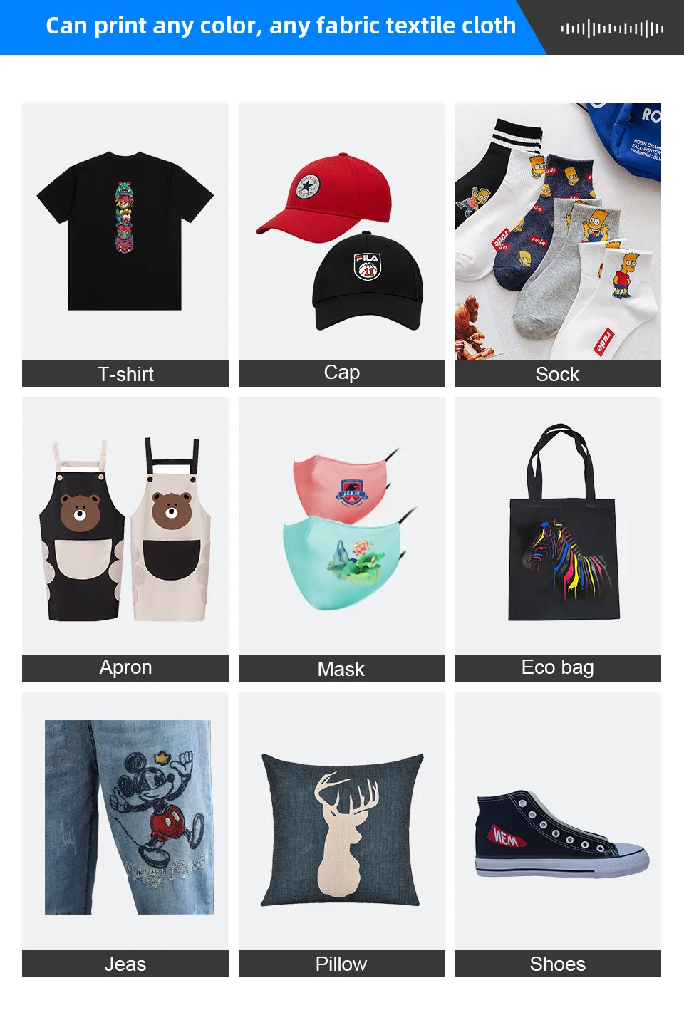 Он может напечатать футболку, шапку, носок, фартук, маску, сумку, джинсы, подушку, обувь и так далее.