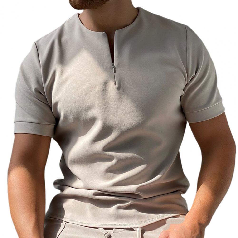 Летняя популярная мужская футболка однотонного цвета, универсальная свободная футболка на молнии с коротким рукавом и круглым вырезом, удобный топ для улицы, вечерниеОписание: