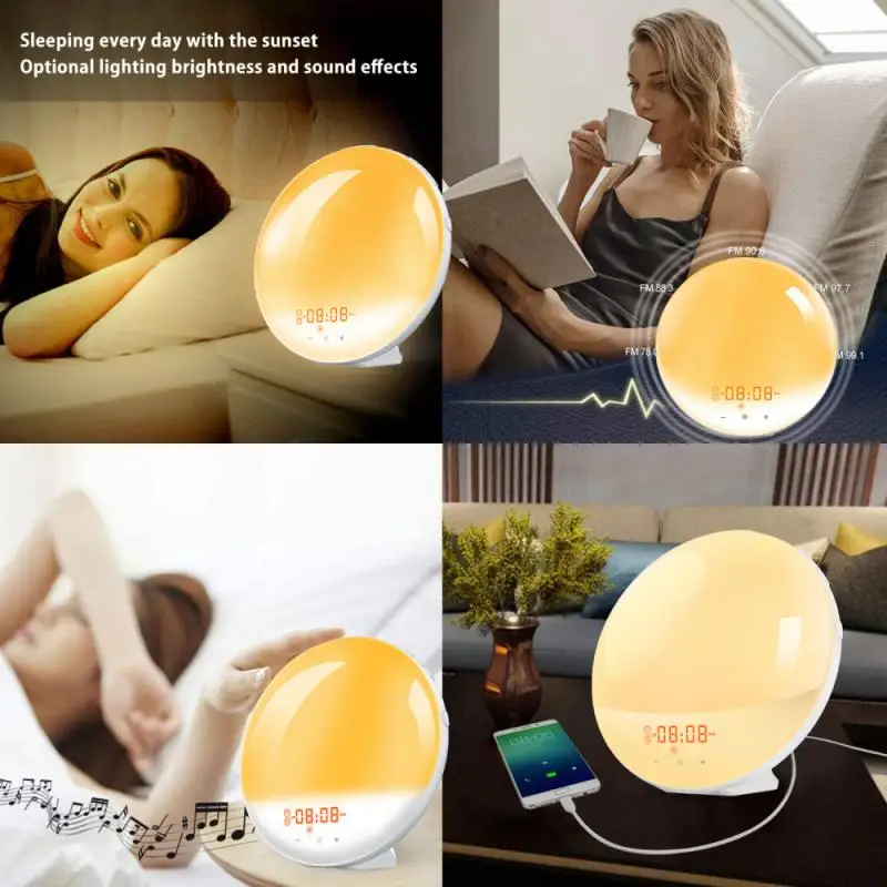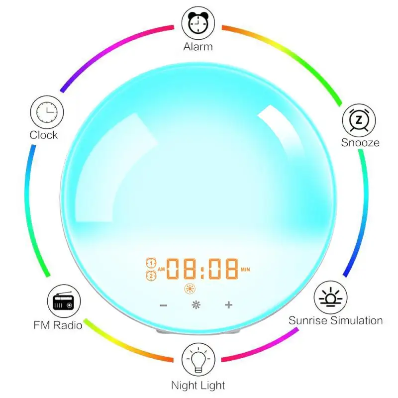 1. Светильник пробуждения и моделирование восхода солнца: Этот цифровой будильник с поддержкой сна предназначен практически для всех, особенно для глубоких спящих и детей. Перед установкой будильника 7 естественных звуковых световых сигналов будут постепенно светиться от 10% яркости до 100%. Если вы считаете, что 30 минут слишком длинные, вы можете настроить процесс на 20 минут или 10 минут. Естественно разбудите вас.