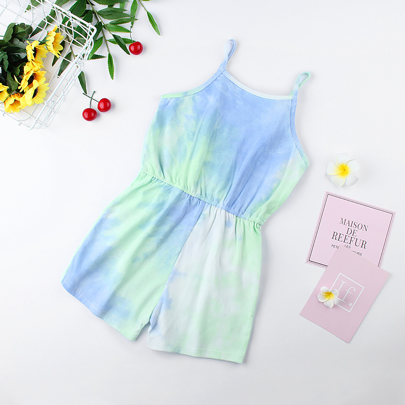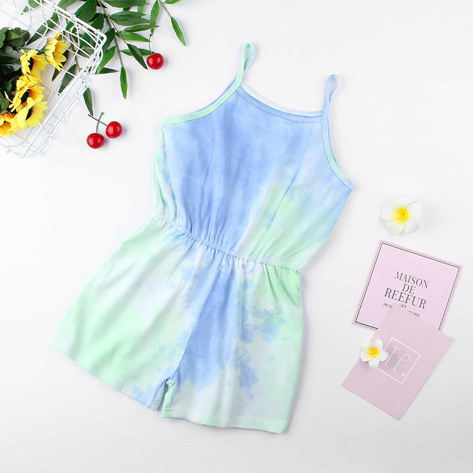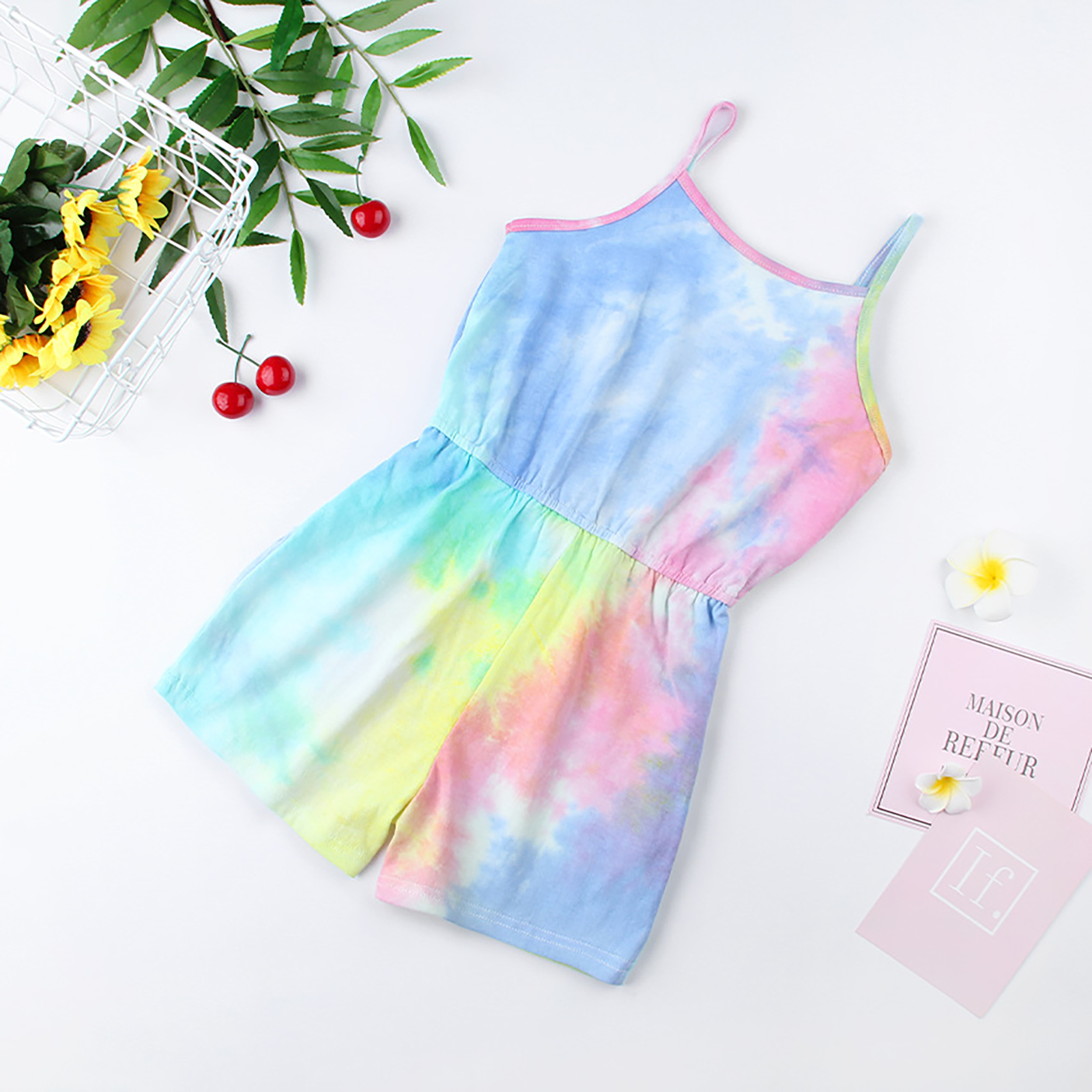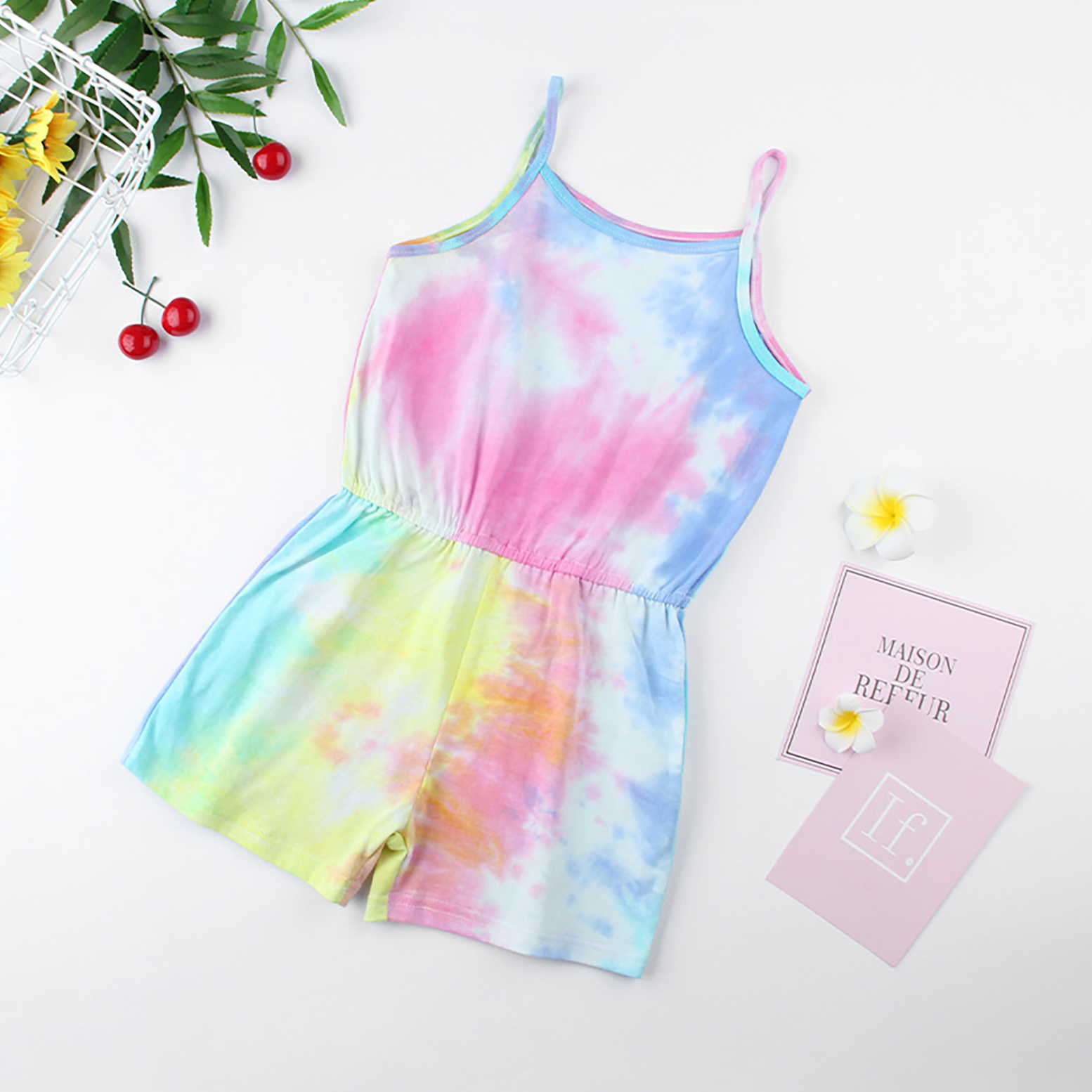 Детский летний хлопковый комбинезон без рукавов с эластичной резинкой на талии и принтом в виде галстука-красителя для девочек.